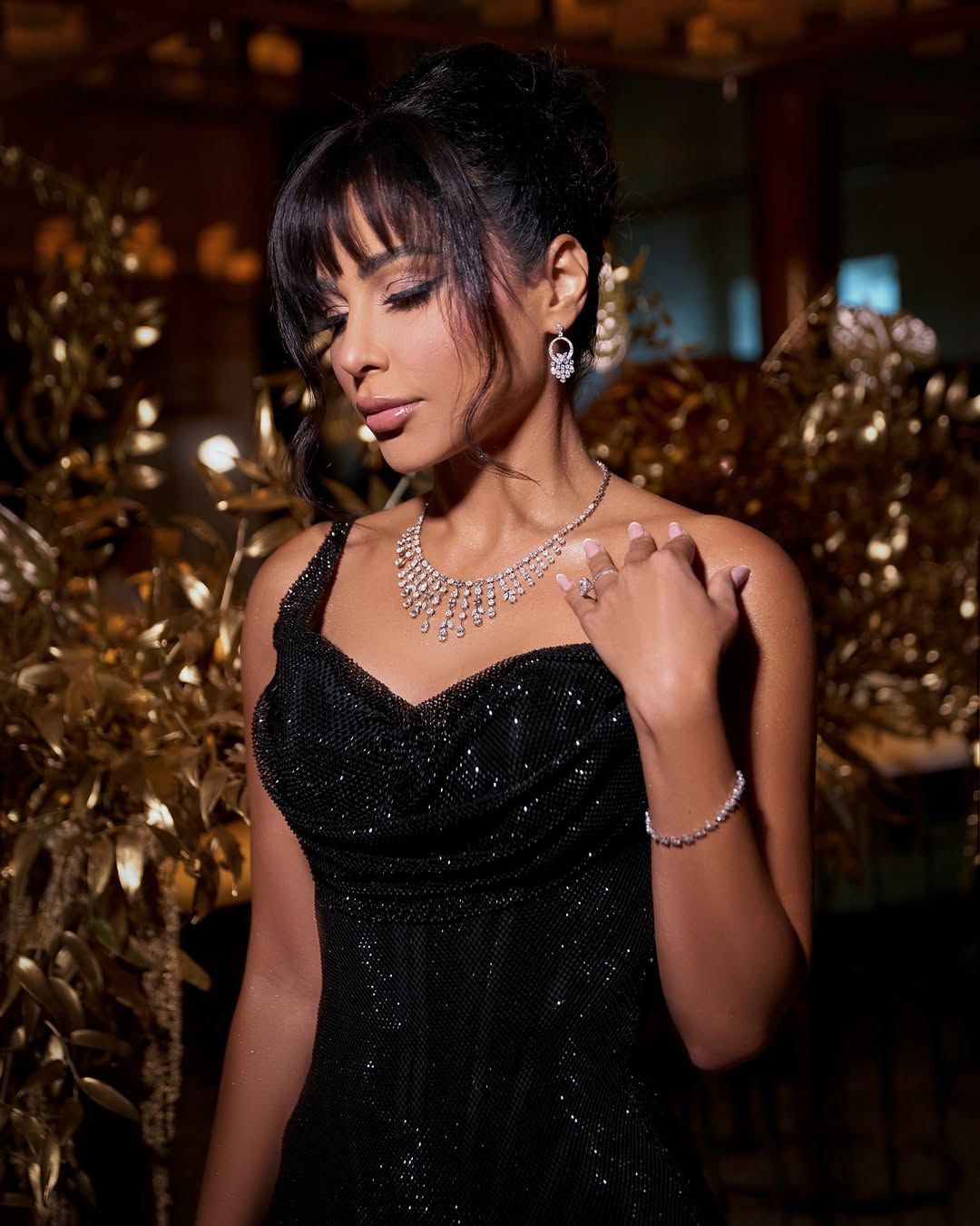 مهيرة عبدالعزيز بفستان أسود براق في احتفال عيد ميلادها