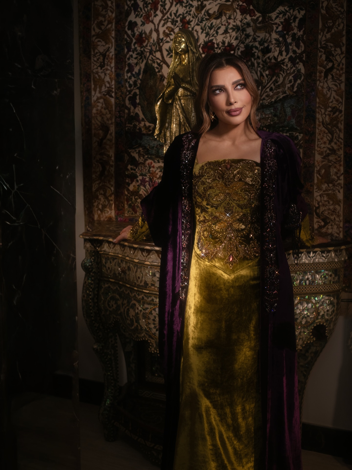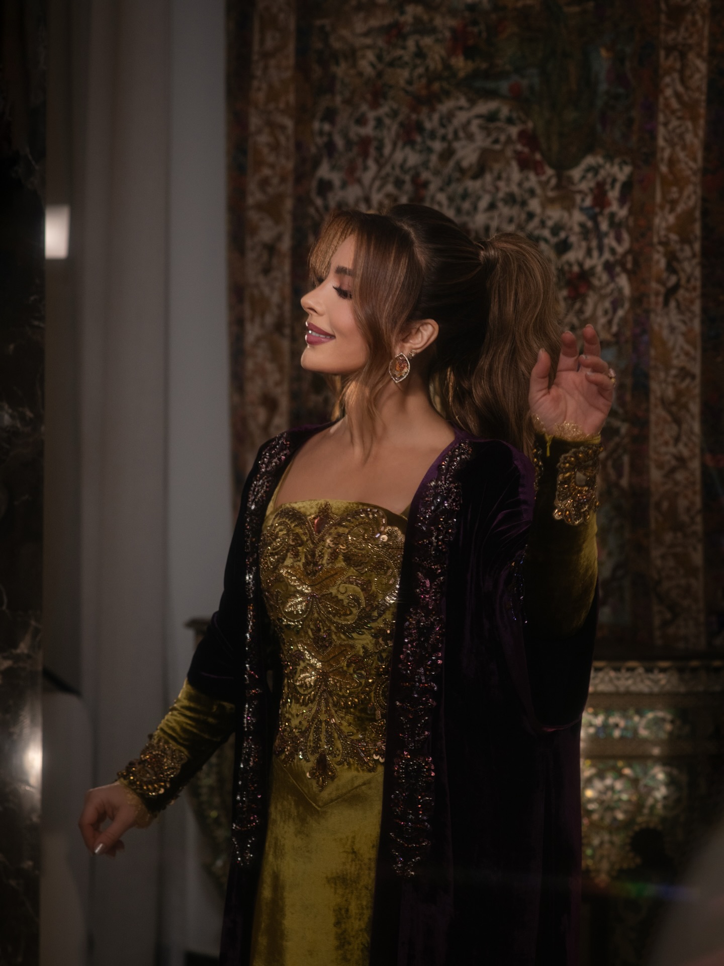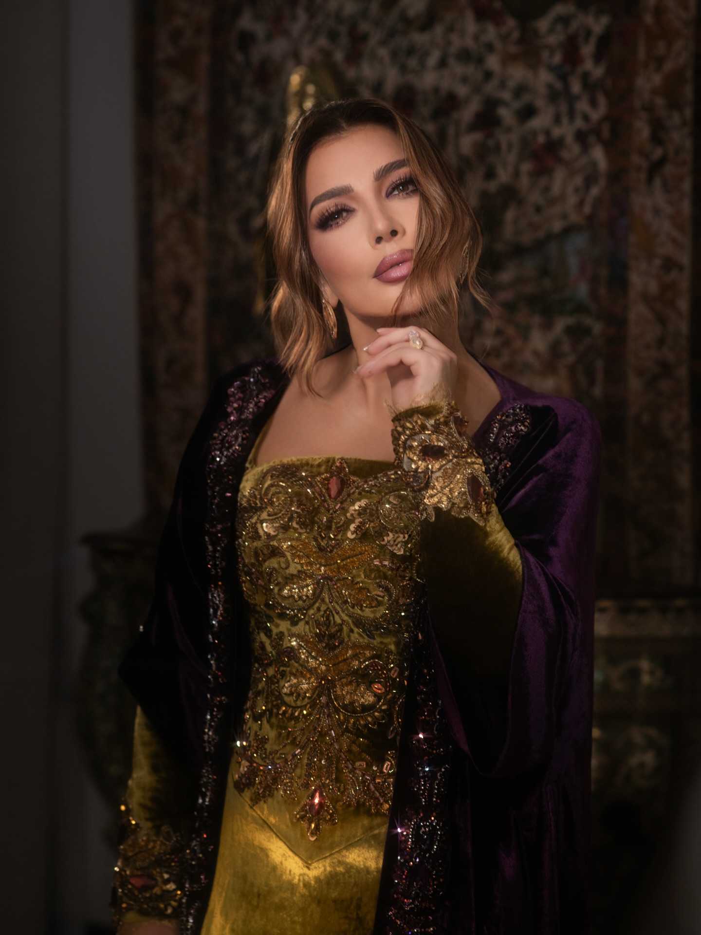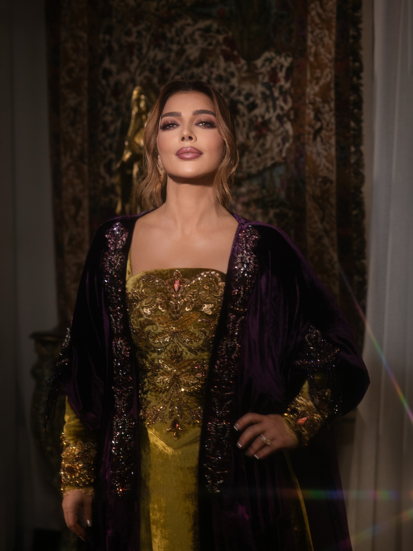 أصالة بعباءة فخمة باللون الأرجواني في أبوظبي