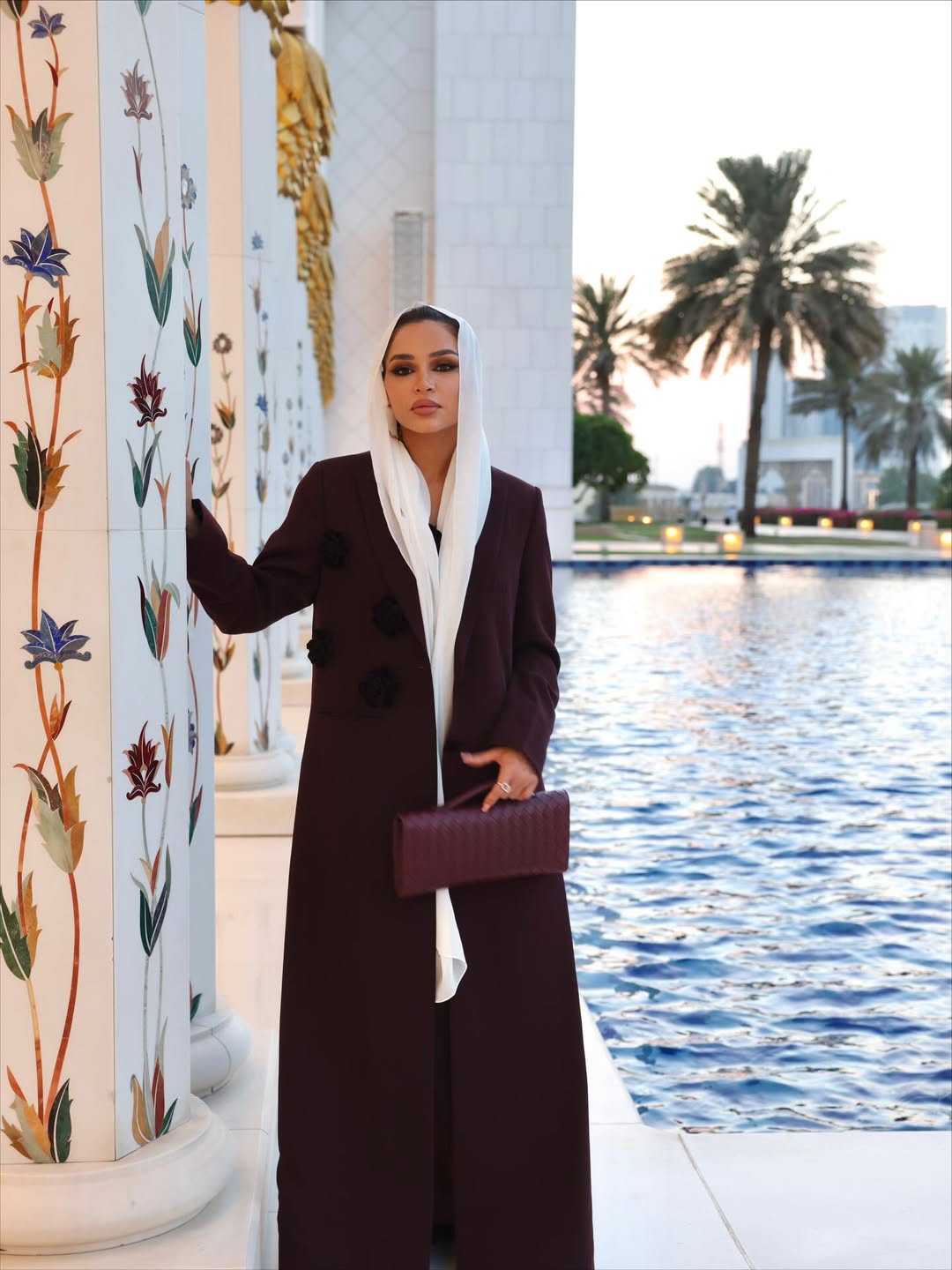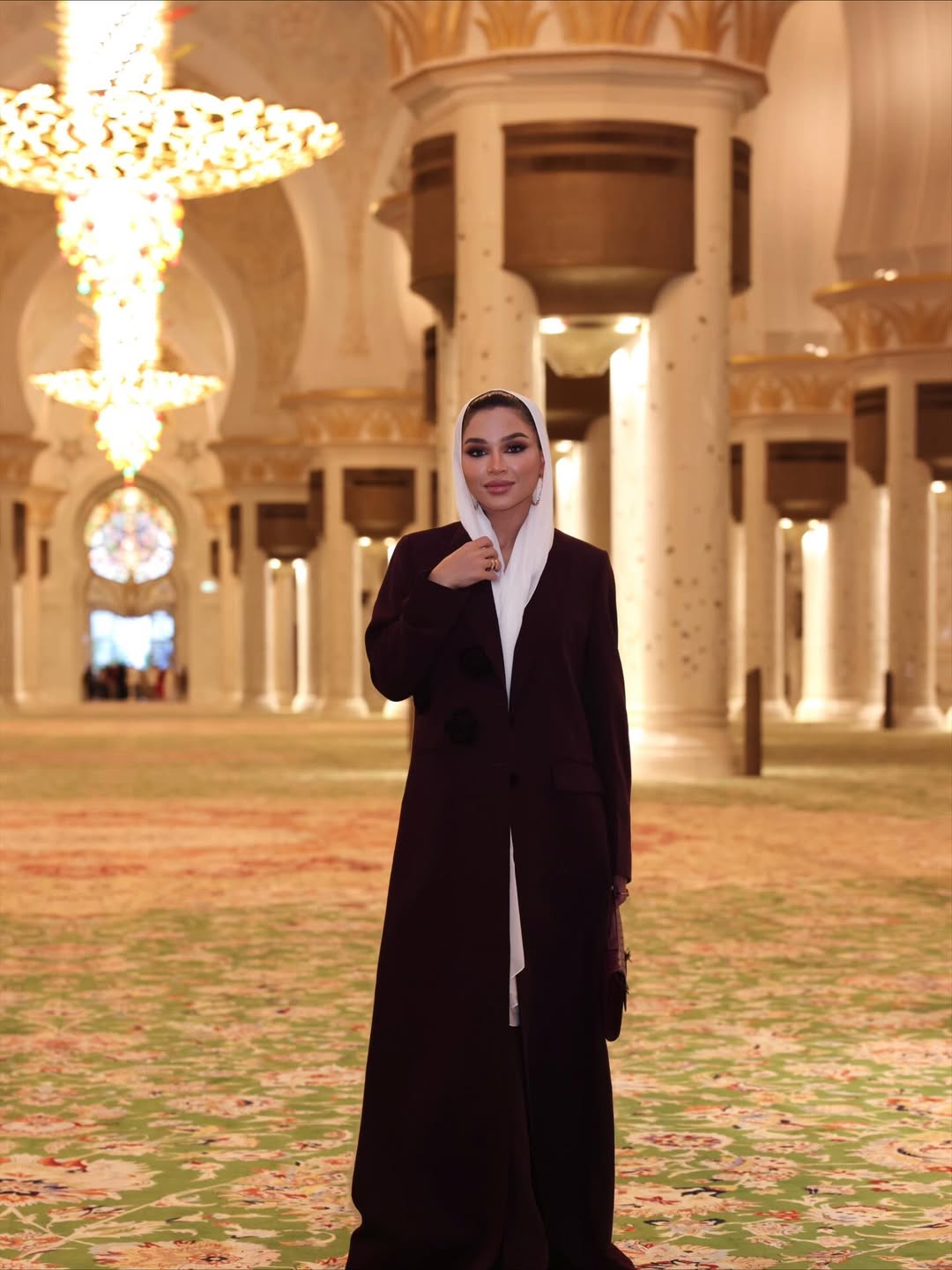 رم - المؤثرة ورائدة الأعمال #نهى_نبيل نشرت صوراً من زيارتها إلى مسجد الشيخ زايد في أبوظبي، ارتدت فيها عباية باللون البرغندي، ونسقت معها وشاحا باللون الأبيض.