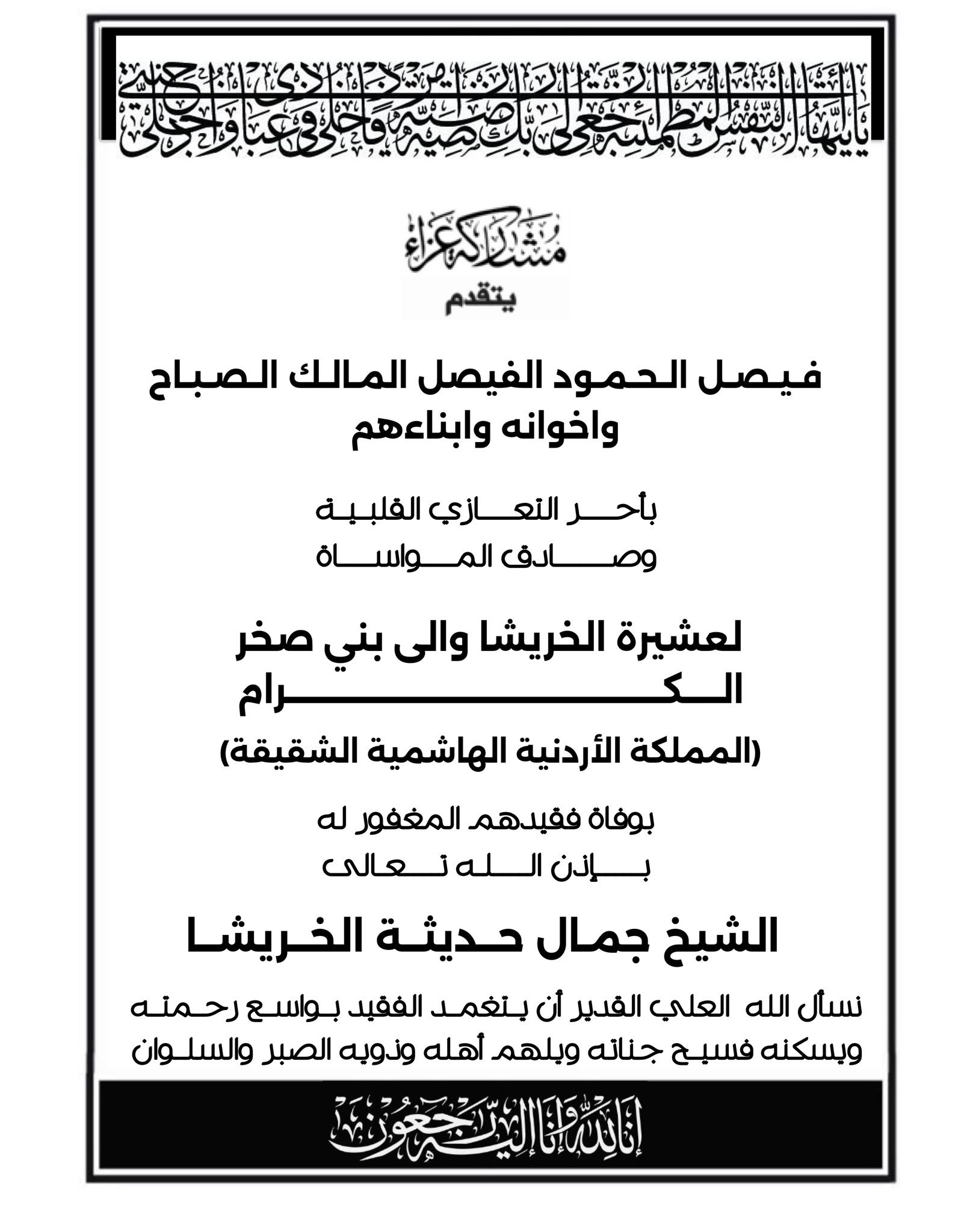 رم - يشاطر المستشار في الديوان الاميري في الكويت، وسفير دولة الكويت في الأردن سابقاً ،الشيخ فيصل الحمود الفيصل المالك الصباح وبأحر مشاعر العزاء والمواساة قبيلة بني صخر الكرام في المملكة الأردنية الهاشمية الشقيقة بوفاة فقيدهم الشيخ جمال حديثة الخريشا ونعم الرجل نسأل الله له الرحمة والمغفرة والجنة ولذويه ومحبّيه جميل الصبر والسلوان عظم الله أجرهم وأحسن الله عزاهم وانا لله وانا اليه راجعون .