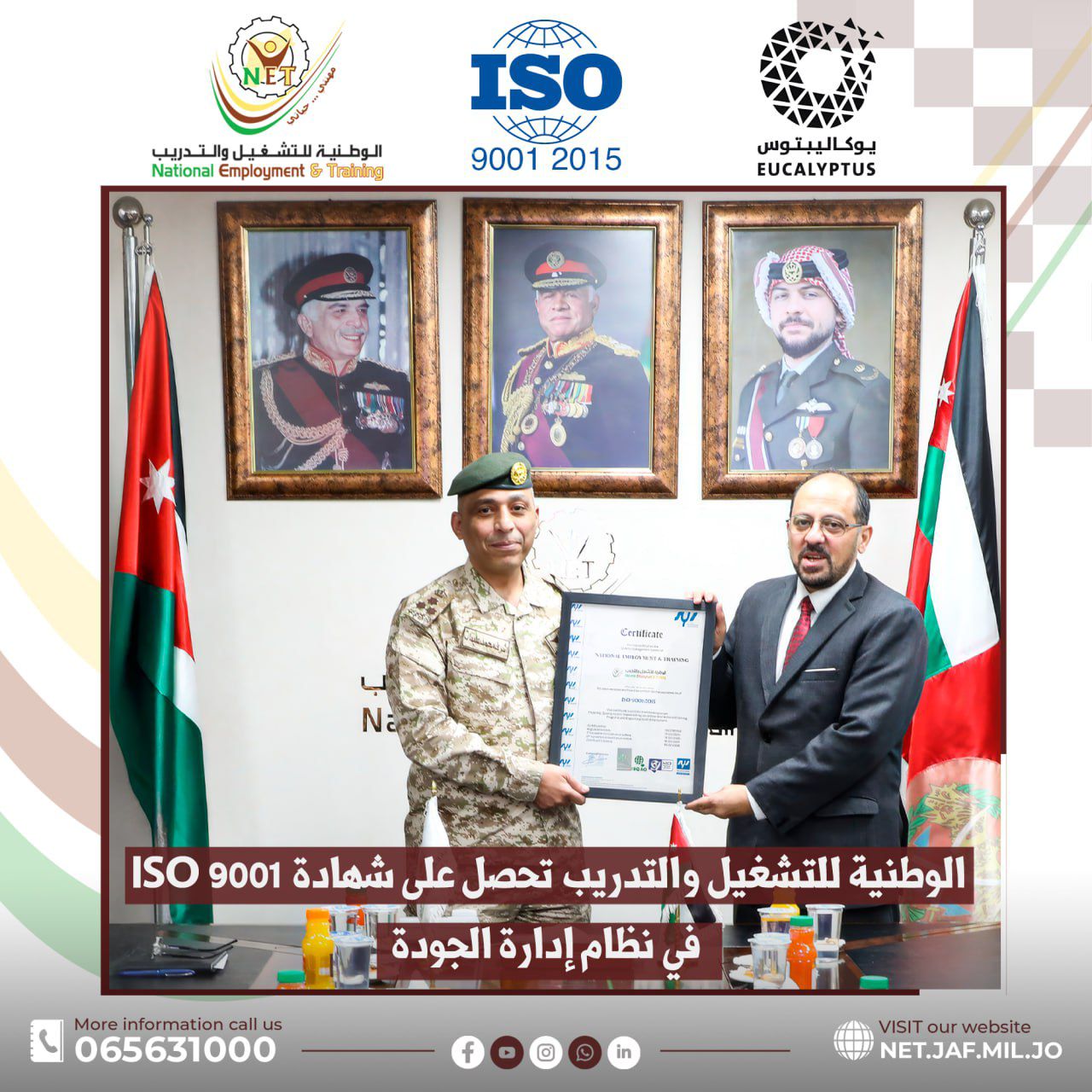 وبهذه المناسبة أكد مدير عام الشركة الوطنية للتشغيل والتدريب العميد الركن أشرف عليمات، أن الحصول على شهادة ISO 9001:2015 يمثل محطة مهمة في مسيرة الشركة نحو التميز المؤسسي، مؤكداً أن هذا الإنجاز هو نتيجة لجهود جماعية وتعاون وثيق بين كافة دوائر ووحدات الشركة المختلفة وبدعم مباشر من القيادة العامة للقوات المسلحة الأردنية – الجيش العربي وبتوجيهات عطوفة رئيس هيئة الأركان المشتركة، وأن تحقيق الشركة هذه الشهادة الدولية يعكس التزامها بتطوير منظومة العمل وتقديم خدمات تدريبية بمعايير عالية الجودة وتعزيز ثقافة الأداء الاحترافي داخل الشركة، مع الاستمرار في الاستثمار بالعنصر البشري وتبني سياسات وممارسات تضمن التحسين المستمر انسجاماً مع الرؤية الوطنية في تمكين الشباب ورفع تنافسيتهم في سوق العمل، مشيراً إلى أن هذه الشهادة تمثل خطوة أساسية نحو التوسع في الحصول على شهادات دولية إضافية تعزز جودة العمل المؤسسي.