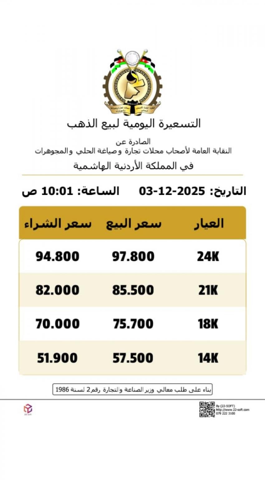 أما أسعار بيع الذهب للعيارات الأخرى، فقد سجل سعر غرام عيار (24) في محال الصاغة 97.80 دينارا، في حين بلغ سعر بيع غرام الذهب من عيار (18) 75.70 دينارا، وعيار (14) بلغ سعره 57.5 دينارا.