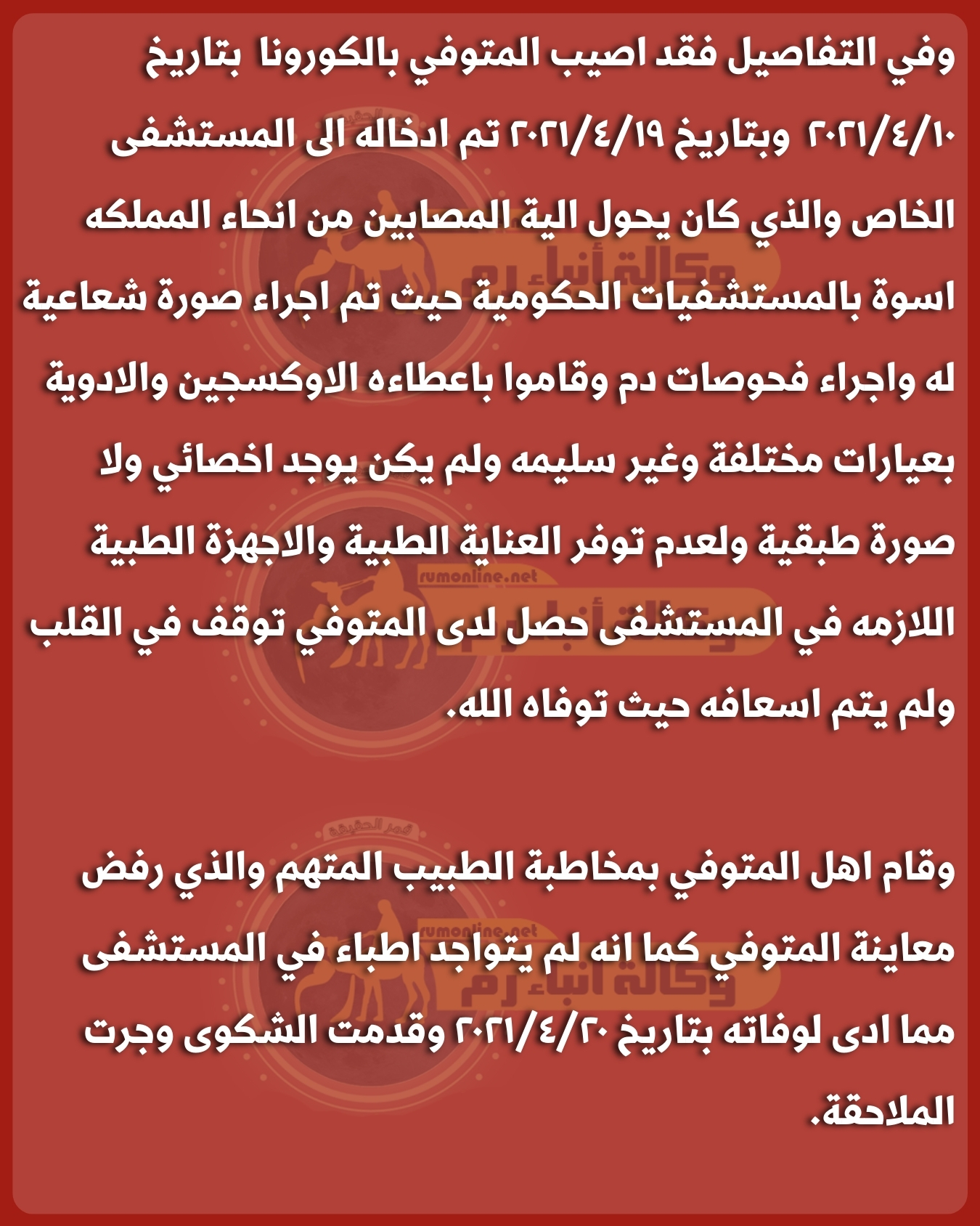 لاول مرة .. وتفاصيل مرعبة "لم يمت بالكورونا بل بخطأ طبي في مستشفى خاص وعقوبات مغلظة "