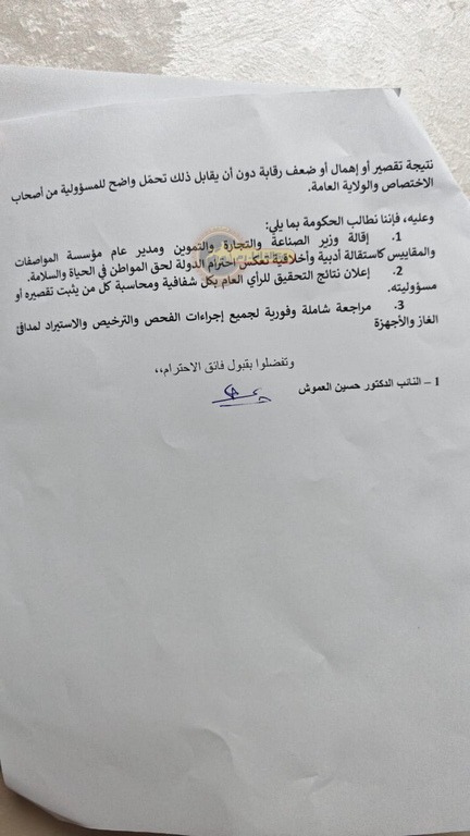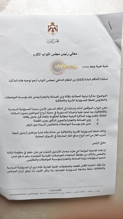 وجاء في نص المذكرة : " إن هذه الفاجعة المؤلمة التي هزت وجدان الأردنيين كشفت عن خلل خطير في منظومة الرقابة والفحص والتأكد من مطابقة المنتجات للمواصفات القياسية المعتمدة، وهو ما يقع ضمن صميم مسؤوليات وزارة الصناعة والتجارة ومؤسسة المواصفات والمقاييس.