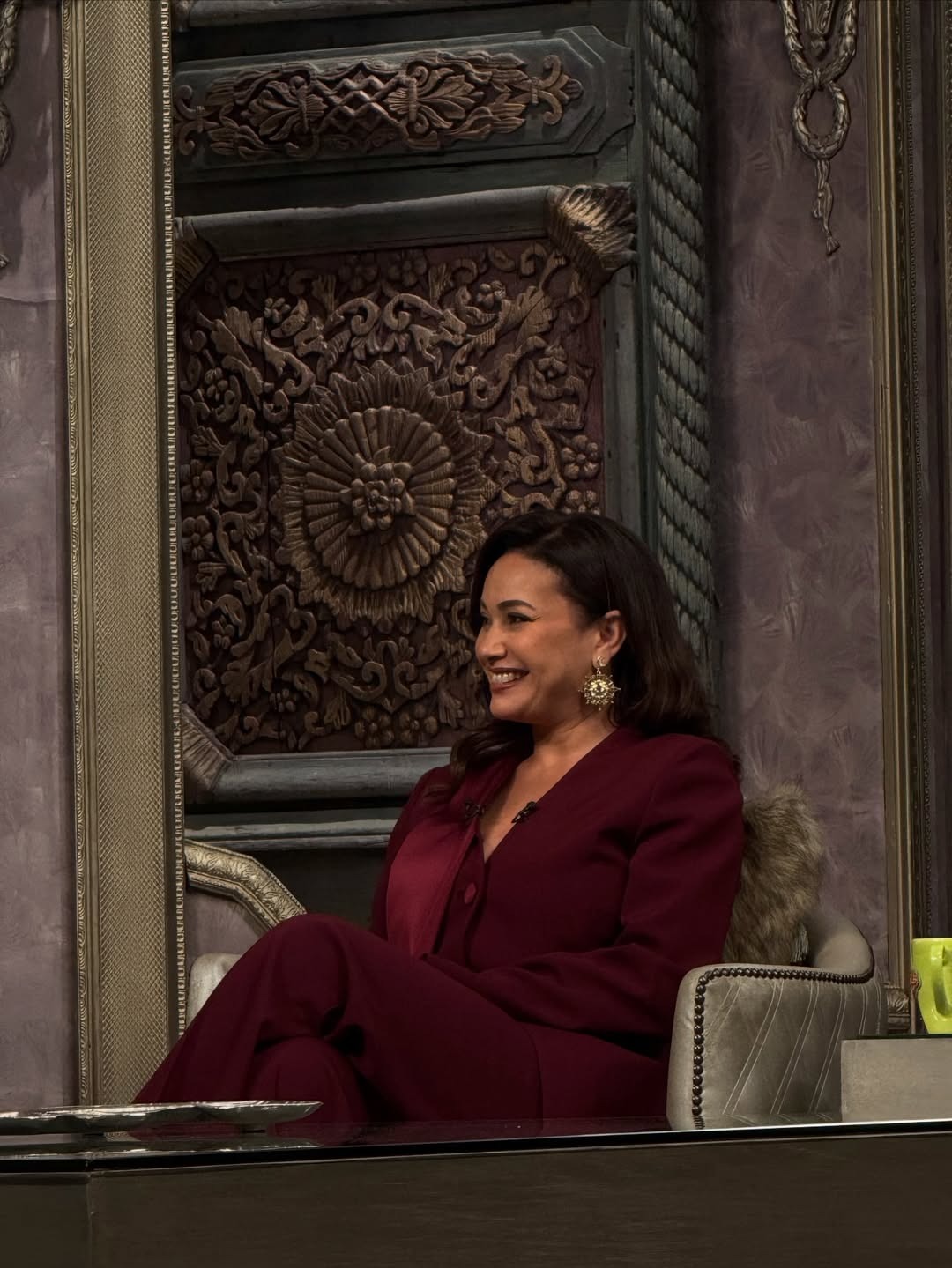 رم - أطلت النجمة التونسية هند صبري على متابعيها في حلقة مميزة مع النجمة إسعاد يونس ببرنامجها صاحبة السعادة، واختارت هند إطلالة البدلة الرسمية باللون الخمري من علامة Christina Léon.