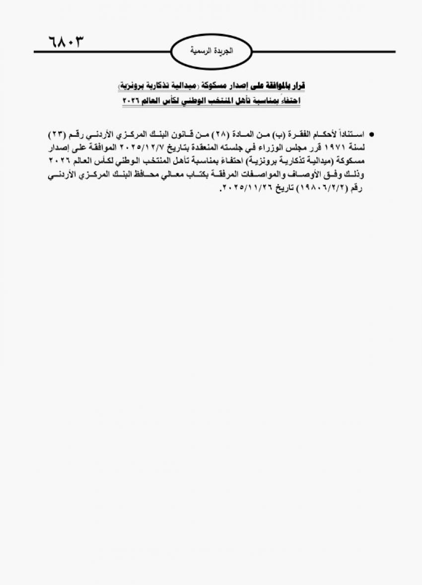 رم - صدر في عدد الجريدة الرسمية، الثلاثاء، قرار بالموافقة على إصدار عملة تذكارية برونزية بمناسبة تأهل المنتخب الوطني لكرة القدم إلى نهائيات كأس العالم 2026.