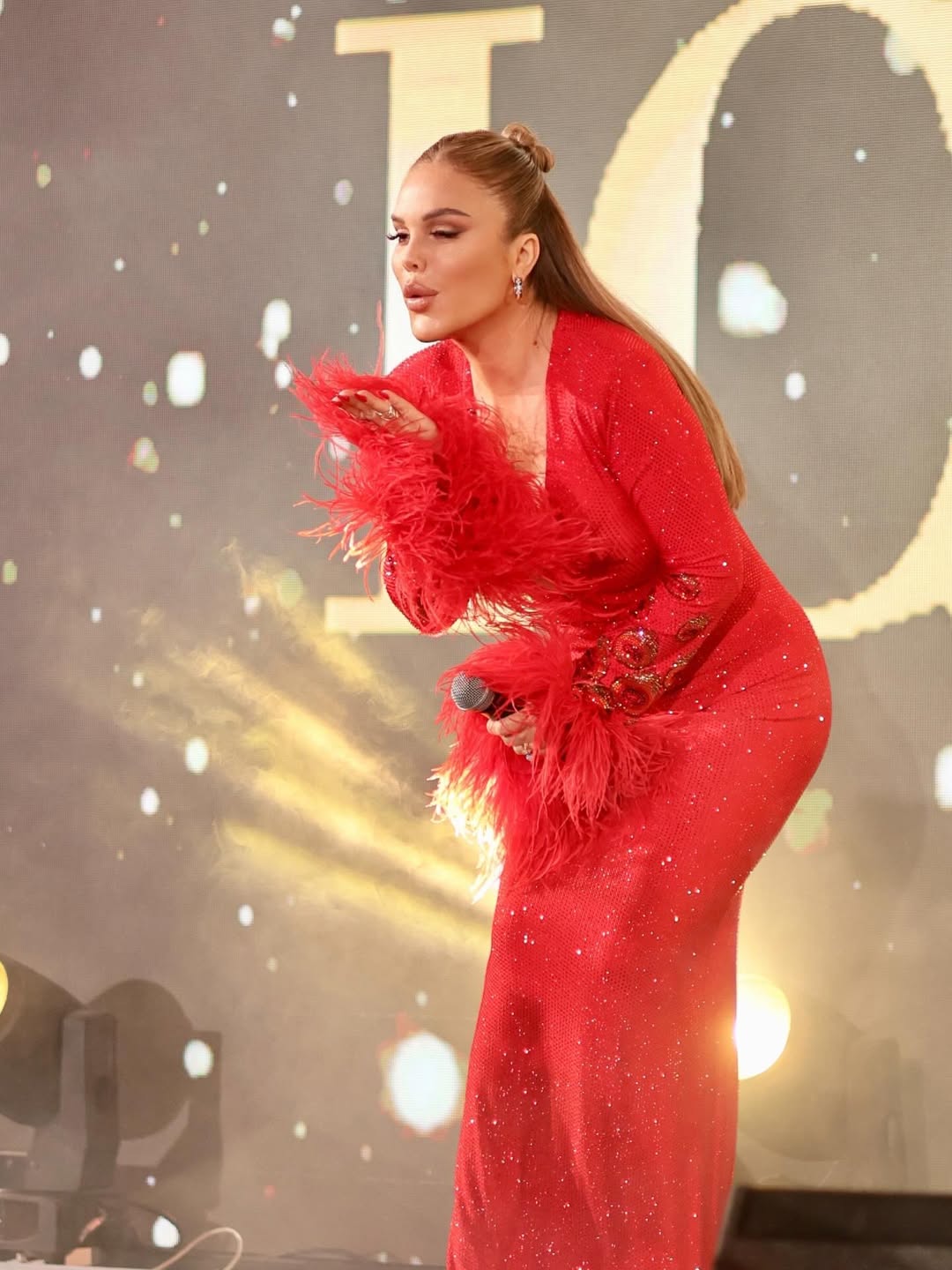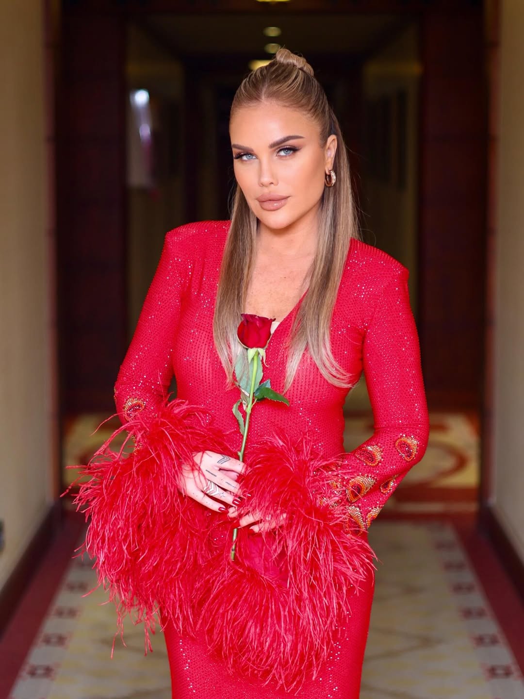 نيكول سابا بفستان أحمر مزين بالريش