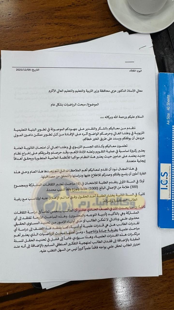 وأضاف العفوري في كتاب وجهه إلى وزير التربية والتعليم الدكتور عزمي محافظة، إن امتحان الثانوية العامة يُعد الركيزة الأساسية في عملية التقويم التربوي وهو الأداة الأهم لتحديد المسار الأكاديمي للطلبة، مؤكداً تقديره لجهود وزارة التربية والتعليم في تطوير النظام ومواكبته للأنظمة العالمية الحديثة، إلا أن التطبيق العملي كشف عن ملاحظات تستدعي الدراسة والمراجعة.