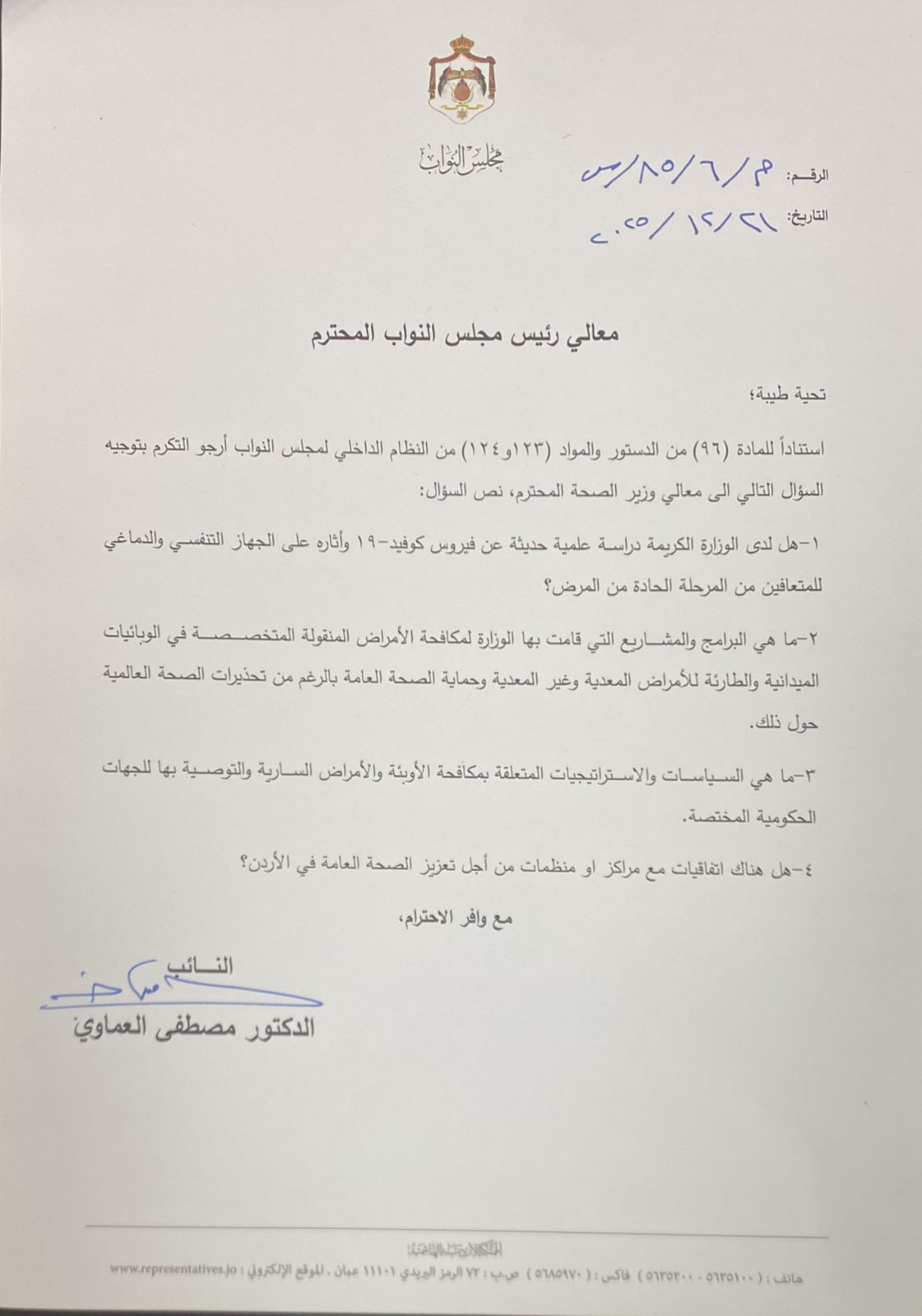 رم - وجّه النائب الدكتور مصطفى العماوي عدة أسئلة نيابية إلى الحكومة، استنادًا لأحكام المادة (96) من الدستور والمادتين (123 و124) من النظام الداخلي لمجلس النواب، تناولت ملفات مالية وزراعية وصحية.