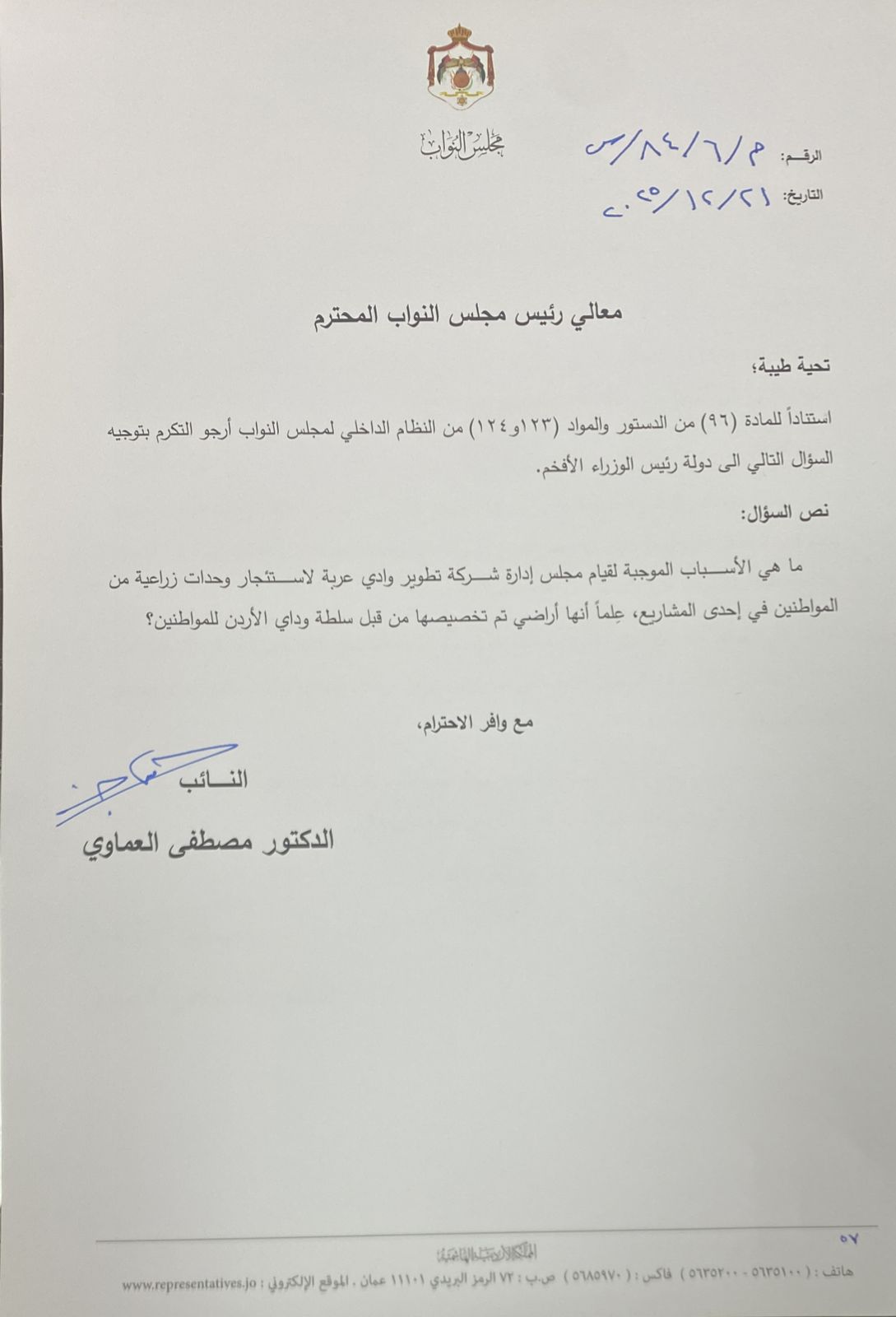 ووجّه العماوي سؤالًا إلى رئيس الوزراء حول الأسباب الموجبة لقيام مجلس إدارة شركة تطوير وادي عربة باستئجار وحدات زراعية من مواطنين، رغم أن هذه الأراضي مخصصة اساساً لهم من قبل سلطة وادي الأردن ضمن مشاريع رسمية، متسائلًا عن الأسس القانونية والإدارية التي استند إليها هذا القرار.