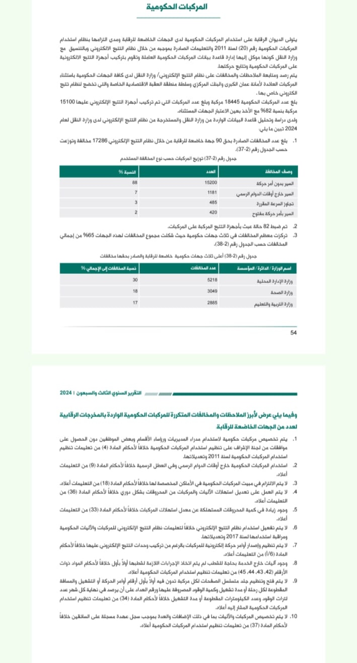 كشف تقرير ديوان المحاسبة لعام ٢٠٢٤ المتعلق بالمركبات الحكومية بان وزارة البلديات قد ارتكبت ٥٢١٨ مخالفة وبنسبة ٣٠% من مجموع مخالفات المركبات التي عليها اجهزة متابعه .