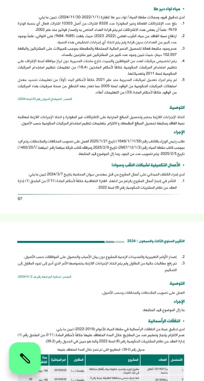 وتبين ايضا ارتفاع فاقد المياه بنسبة ٨٥% ووجود اعداد كبير من العدادت بدون قراءة ولم يتم اتخاذ اي اجراء لمعالجة هذه المخالفات .
