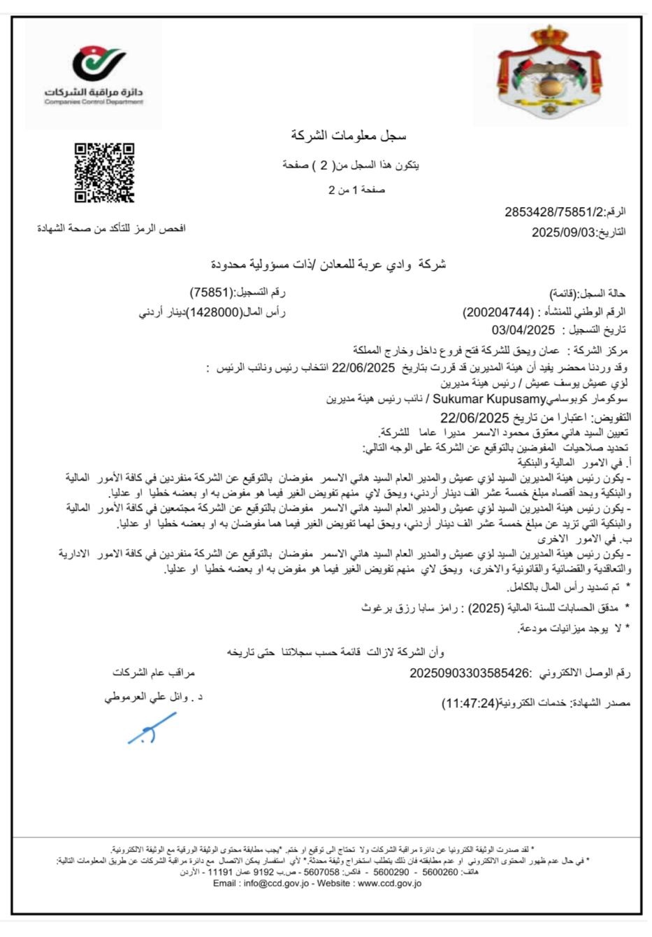 رم - بيّنت وثائق تسجيل رسمية أن اتفاقيات الاستكشاف الموقعة ضمن مشروع تعدين في منطقة وادي عربة تضمنت التزامات مالية واضحة شملت إيداع رأس مال معلن وتقديم كفالات مالية لصالح الحكومة خلال المرحلة الأولى من الاتفاقية التنفيذية.