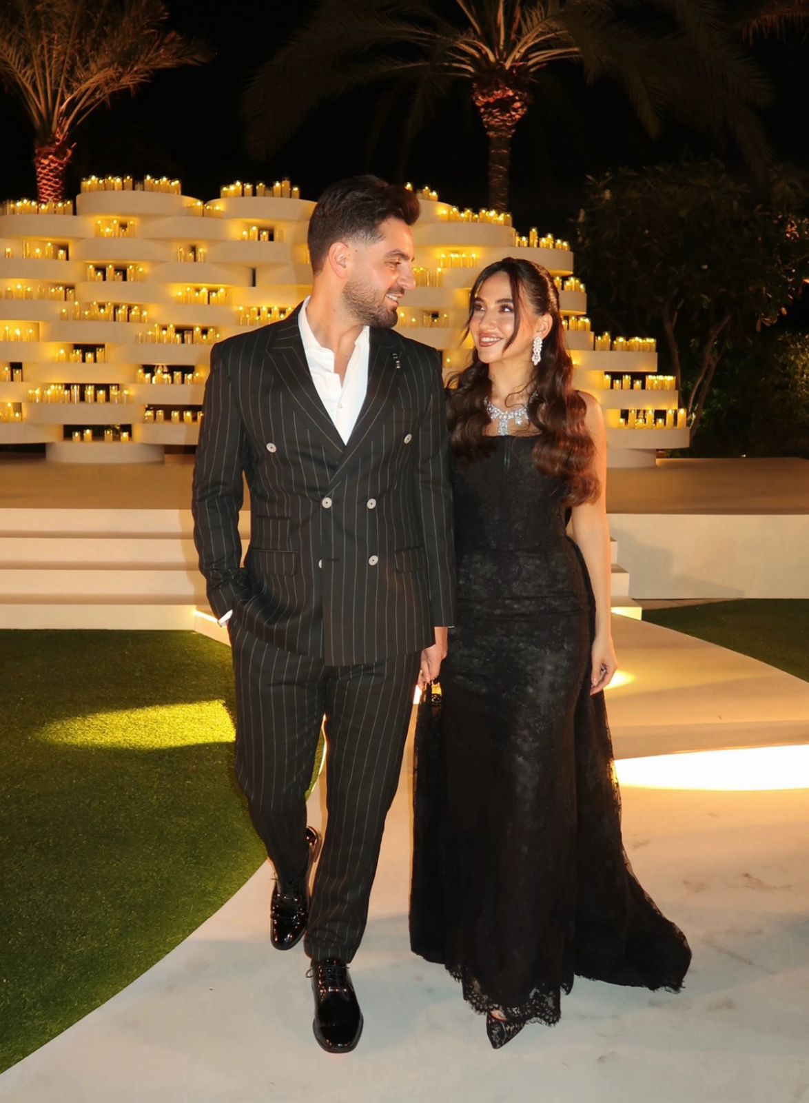 سارة أطلّت برفقة زوجها #غيث_مروان في صور شاركتها عبر ستوري "إنستغرام" مرتديًا بدلة سوداء مزينة بخطوط بيضاء ناعمة في تنسيق متناغم وأنيق بين الثنائي.