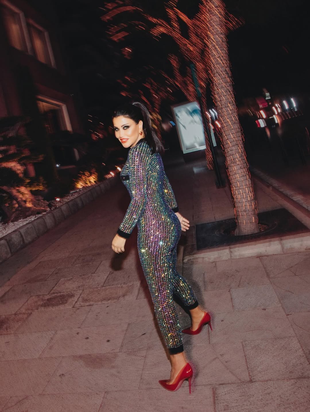 جومانة نسقت مع اللوك كعبًا عاليًا باللون الأحمر، أعطى الستايل شعورًا بالثقة والقوة.