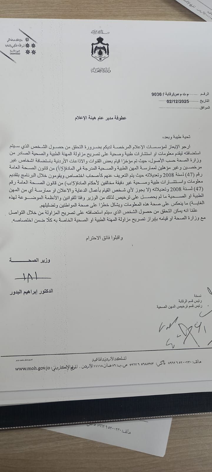 رم - خاص - أحدث كتاب وزارة الصحة الأخير، الذي شدّد من خلاله على ضرورة الالتزام بالقوانين عند تقديم أي معلومات طبية في وسائل الإعلام، صدى واسعًا بين الأطباء حملة البورد الأجنبي ومؤهلي الاختصاص العاملين في المستشفيات الحكومية.