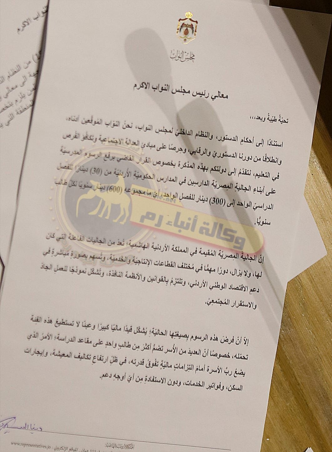 رم - وجّه عدد من النواب مذكرة إلى معالي رئيس مجلس النواب الأكرم، طالبوا فيها الحكومة بإعادة النظر في القرار القاضي برفع الرسوم المدرسية على أبناء الجالية المصرية الدارسين في المدارس الحكومية الأردنية، من (30) دينارًا للفصل الدراسي الواحد إلى (300) دينار للفصل، أي ما مجموعه (600) دينار سنويًا عن كل طالب.