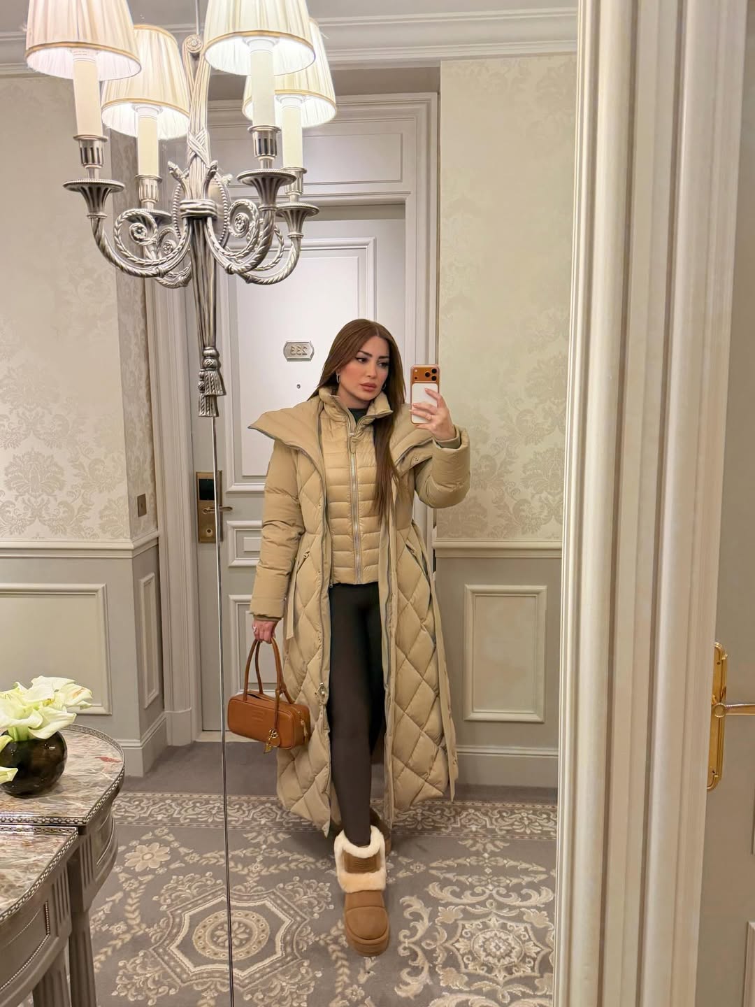 واعتمدت نسرين ستايل شتويًا دافئًا عبارة عن معطف منفوخ باللون البيج اختارت معه حذاء من الصوف وحقيبة يد باللون البني الفاتح.