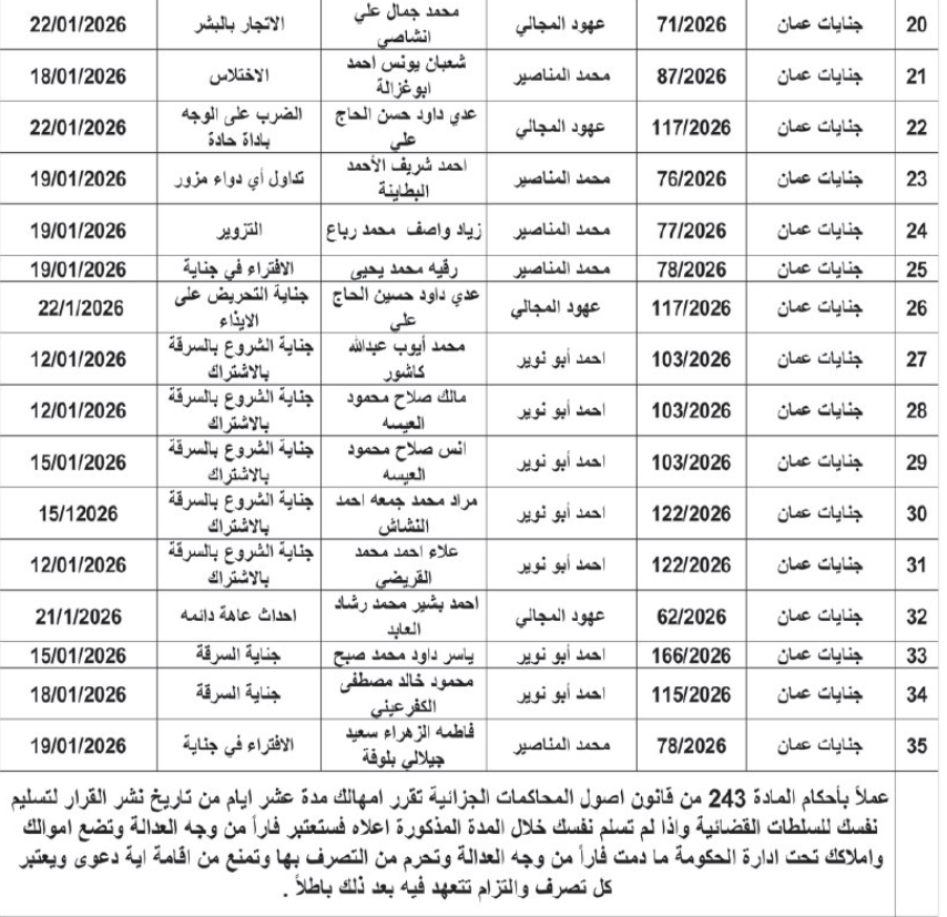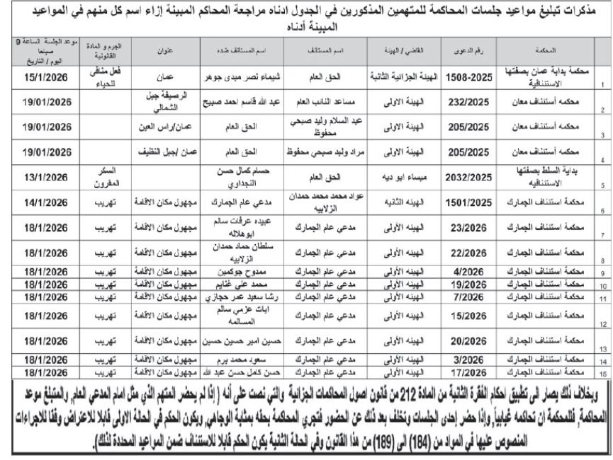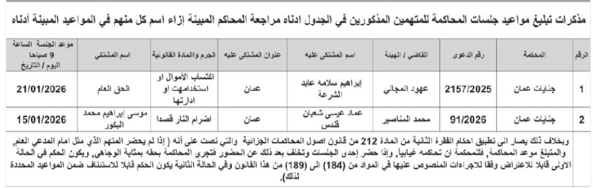 صدرت اليوم الاثنين، مذكرات تبليغ عن محاكم جنايات لمتهمين بدعاوى مختلفة لحضور جلساتهم المدرجة مواعديها في البلاغات.