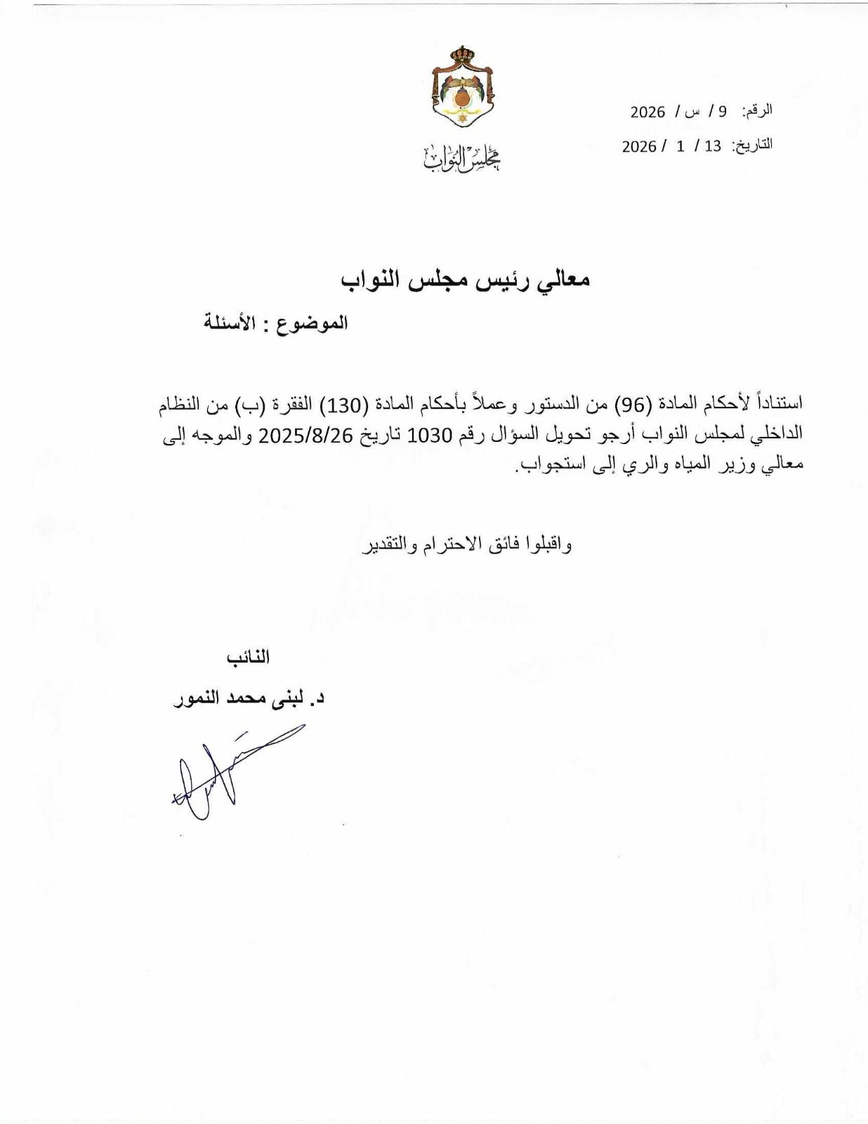 رم - حولت النائب الدكتورة لبنى النمور سؤالها النيابي المتعلق بتكرار انقطاع المياه عن مدينة العقبة إلى استجواب رسمي موجّه إلى وزير المياه والري، في خطوة تصعيدية تهدف إلى محاسبة الحكومة ووضع حدّ لمعاناة المواطنين المتكررة.