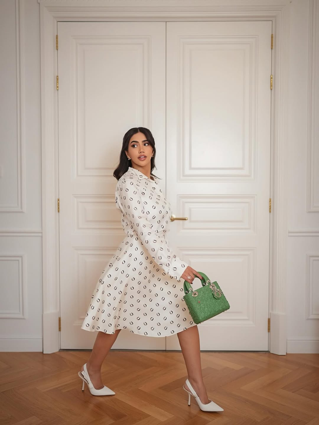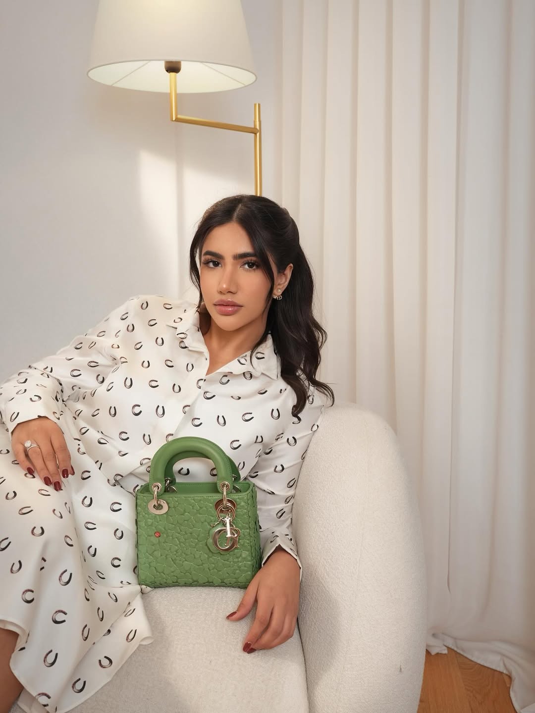 وكانت حقيبة Lady Dior Clover باللون الأخضر العشبي هي نجمة الإطلالة، فهي تحفة نادرة من تصميم جوناثان أندرسون ضمن مجموعته لربيع وصيف 2026، تمزج بين رموز الحظ الإيرلندية والخنفساء الحمراء التي ترمز للطاقة الإيجابية.