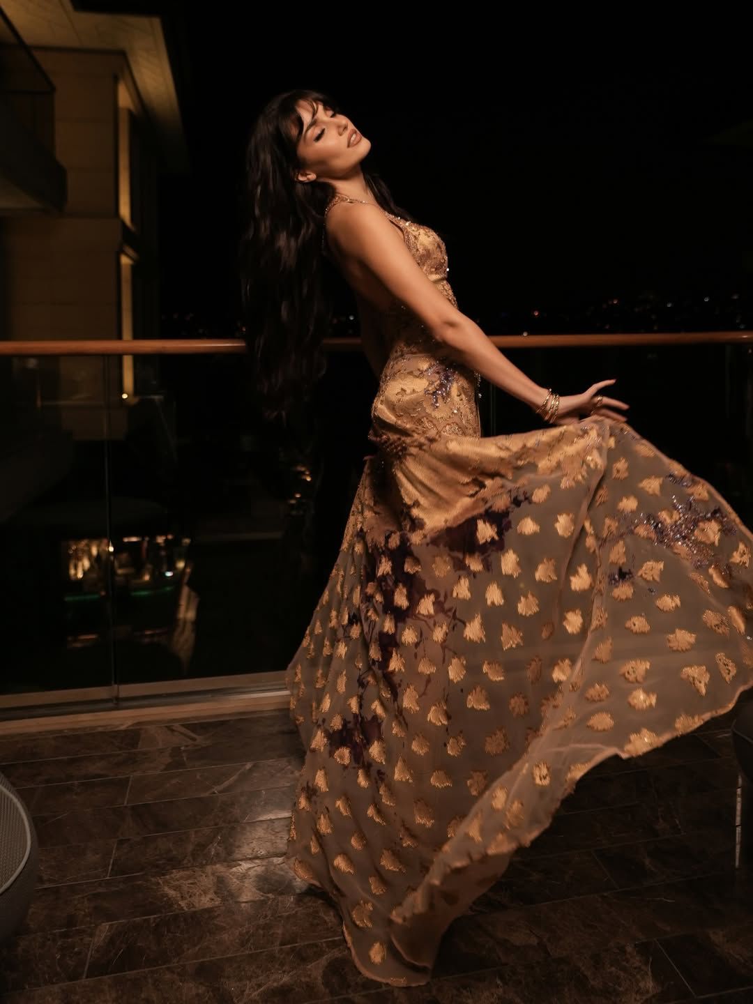 جاءت الإطلالة بتصميم لامع يجمع بيين الكورسيه المطرز بتفاصيل براقة وبنطال ذهبي عالي الخصر، مع ذيل شفاف مطرز أضفى لمسة جريئة على اللوك.