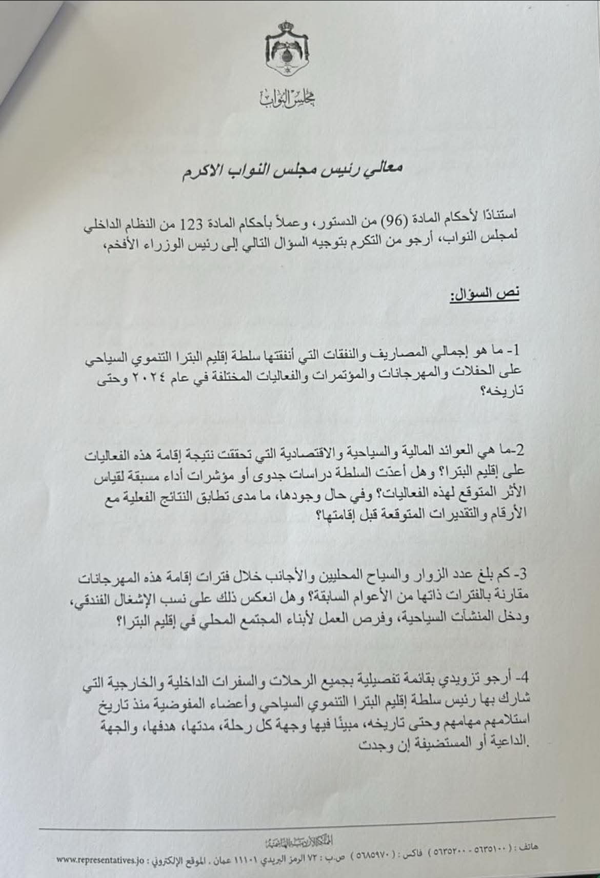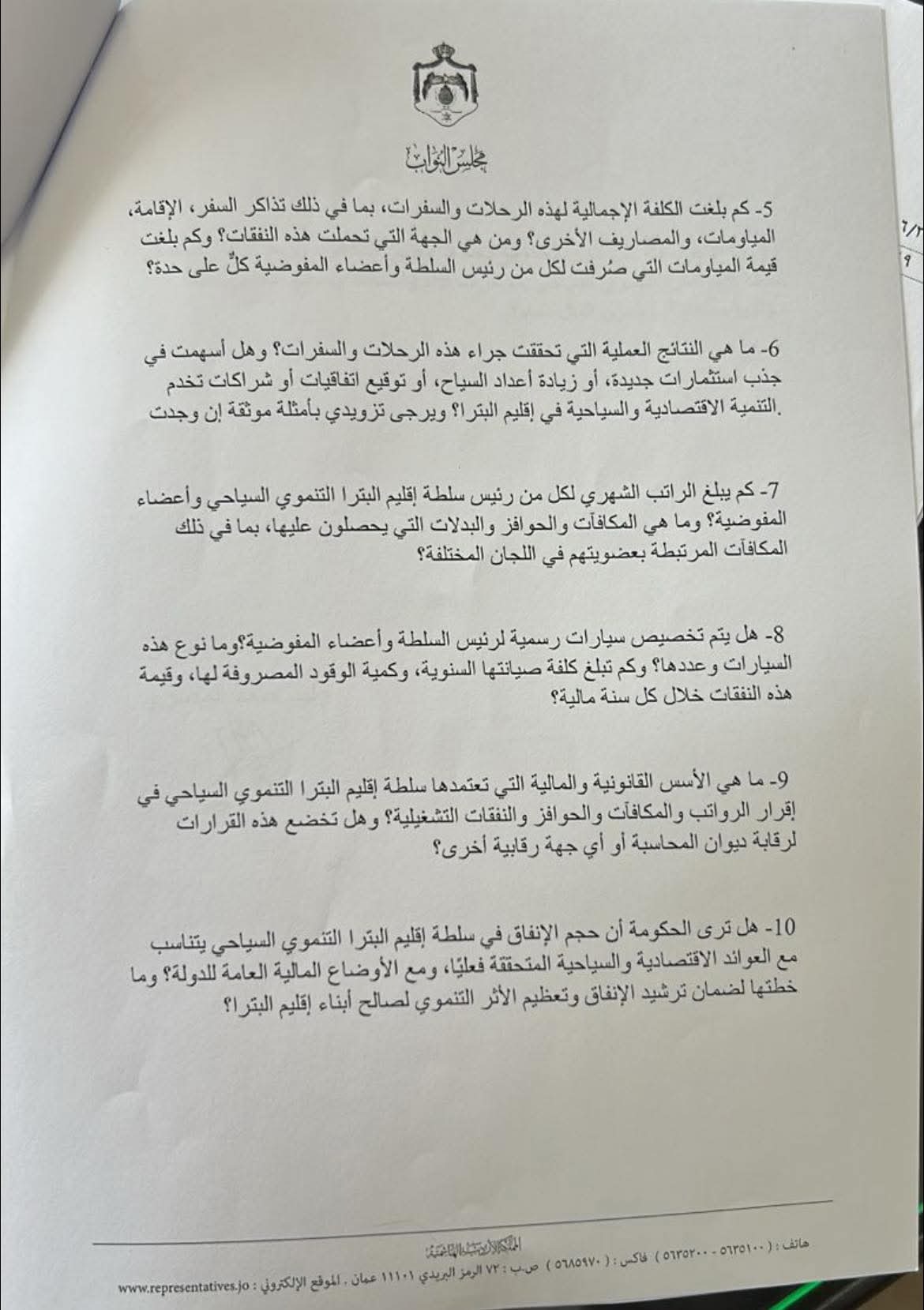 وطالب النائب بقائمة تفصيلية عن رحلات وسفرات رئيس سلطة اقليم البترا الداخلية والخارجية ومعه اعضاء المفوضية ،والكلف الاجمالية لهذه الرحلات وتذاكر السفر والاقامة والمياومات