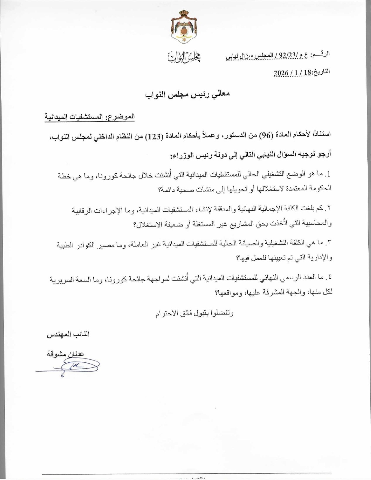 رم - النائب مشوقة يسأل الرئيس حسان عن المستشفيات الميدانية بعد إنتهاء الغاية منها كيف تم الاستفادة منها وماهو مصيرها ومن المسؤول عنها.