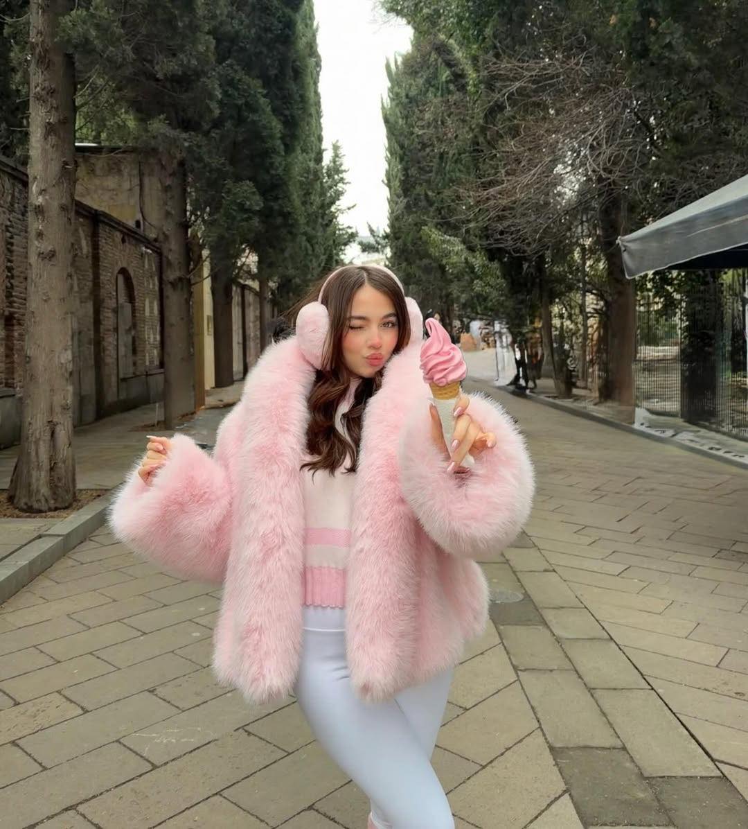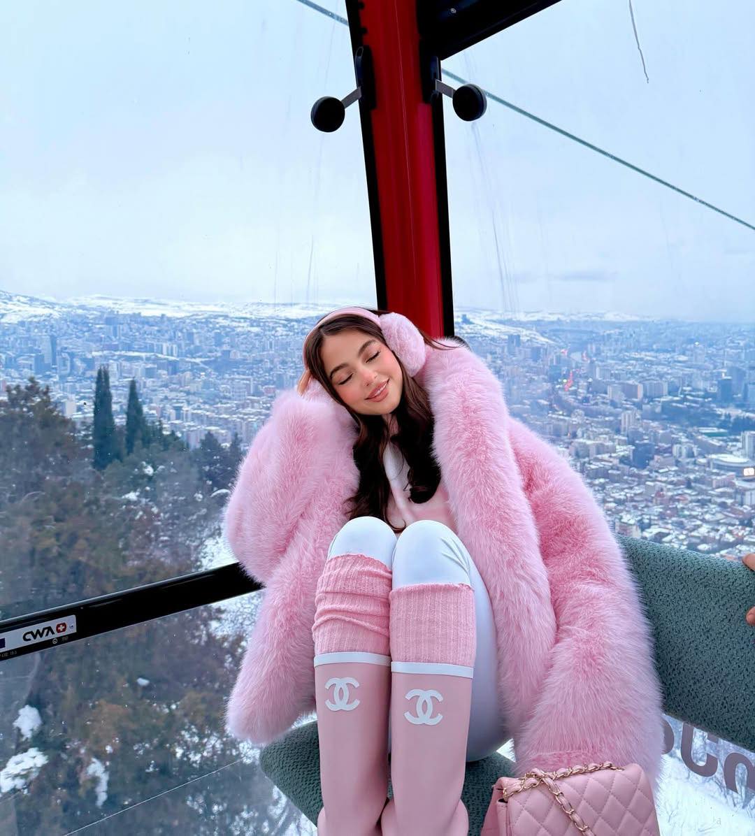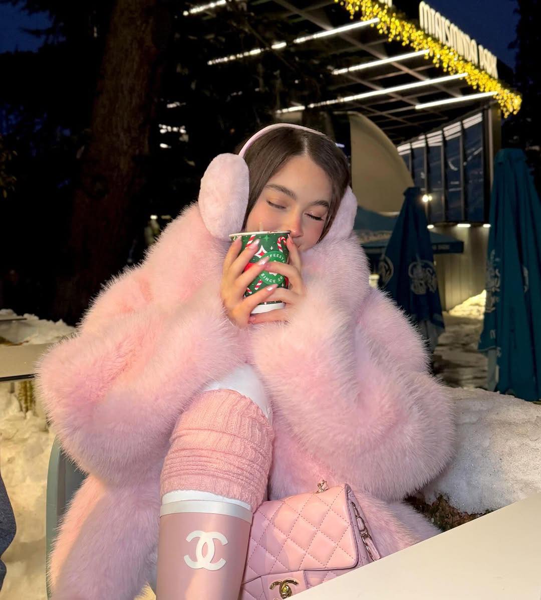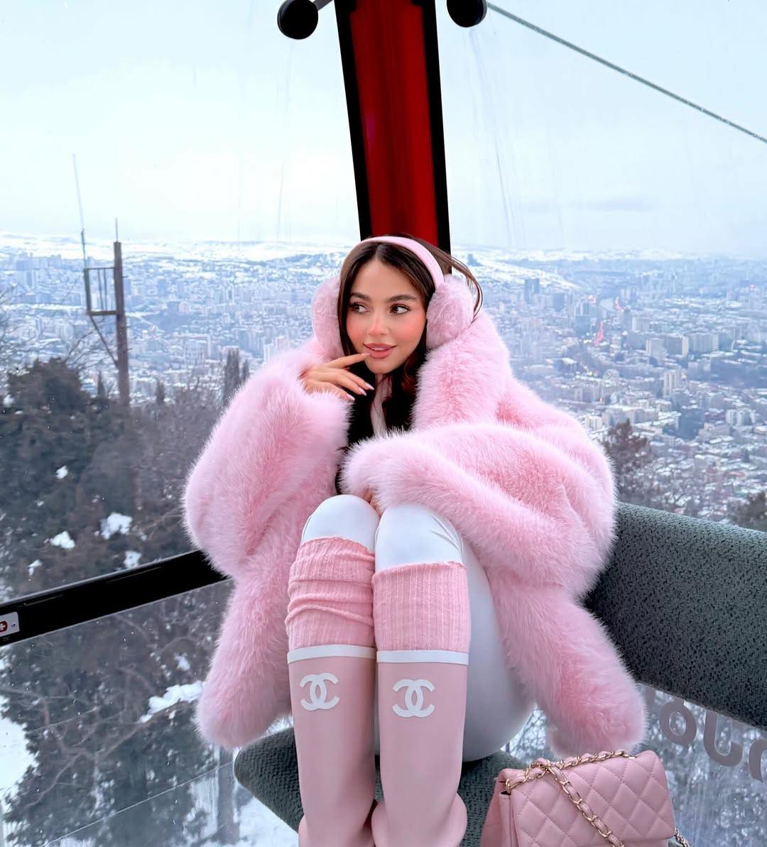 ‎ارتدت معطف فرو واسعًا باللون الوردي، ونسّقته مع حذاء طويل من توقيع Chanel، ما أضفى لمسة فاخرة على الإطلالة، إلى جانب حقيبة باللون والعلامة التجارية ذاتهما، لتعزز انسجام اللوك، وقد وثّقت صورها بين الثلوج عبر حسابها على إنستغرام.
