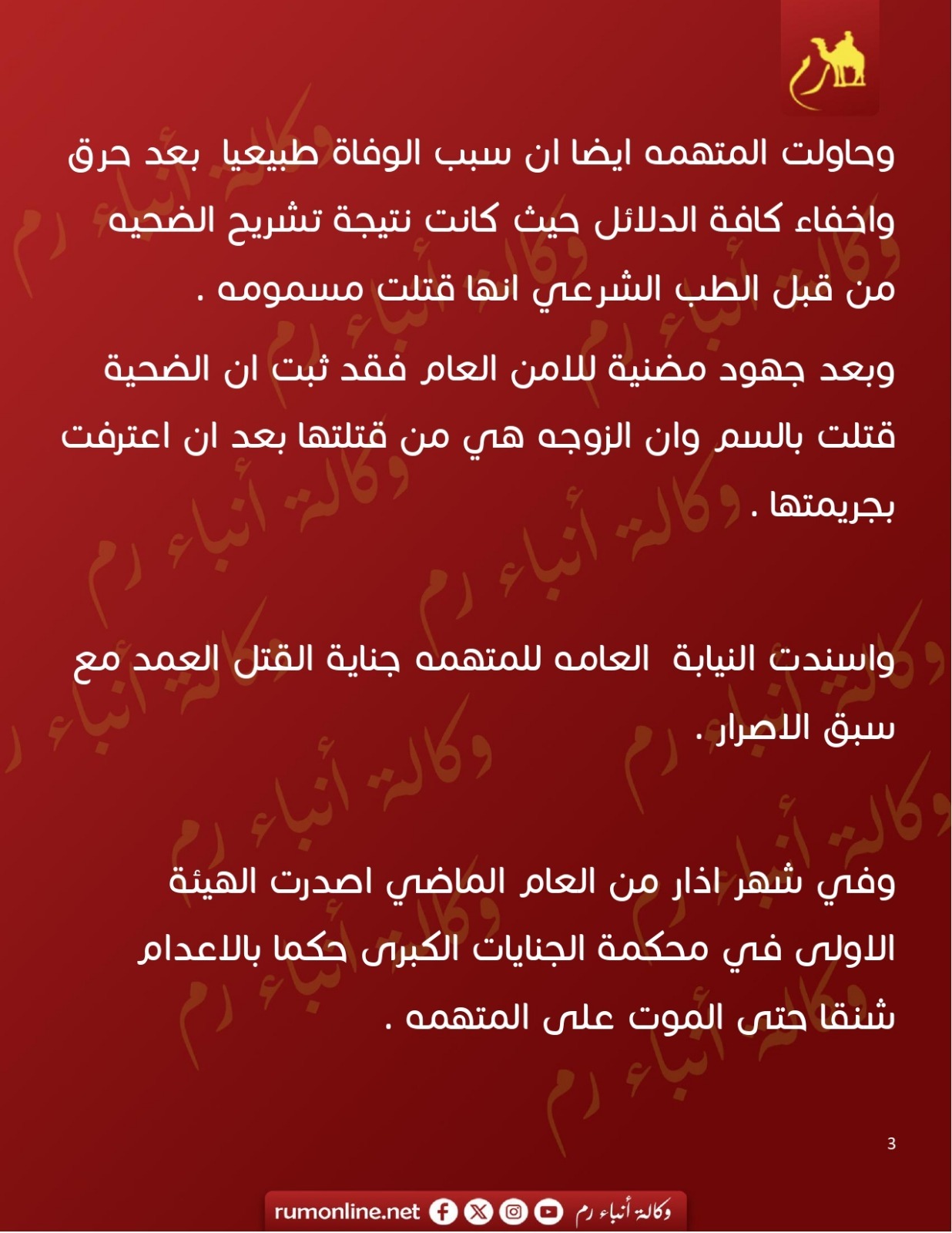 التمييز تؤيد قرار الاعدام بحق زوجة قتلت ابنة زوجها بالسم "رم" تنشر التفاصيل