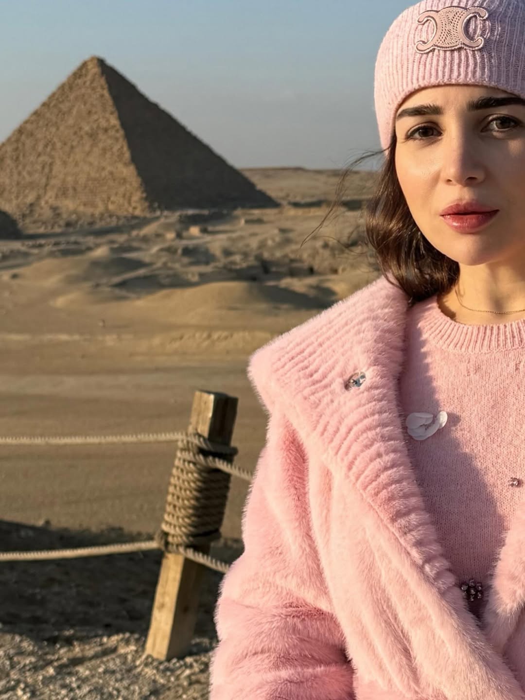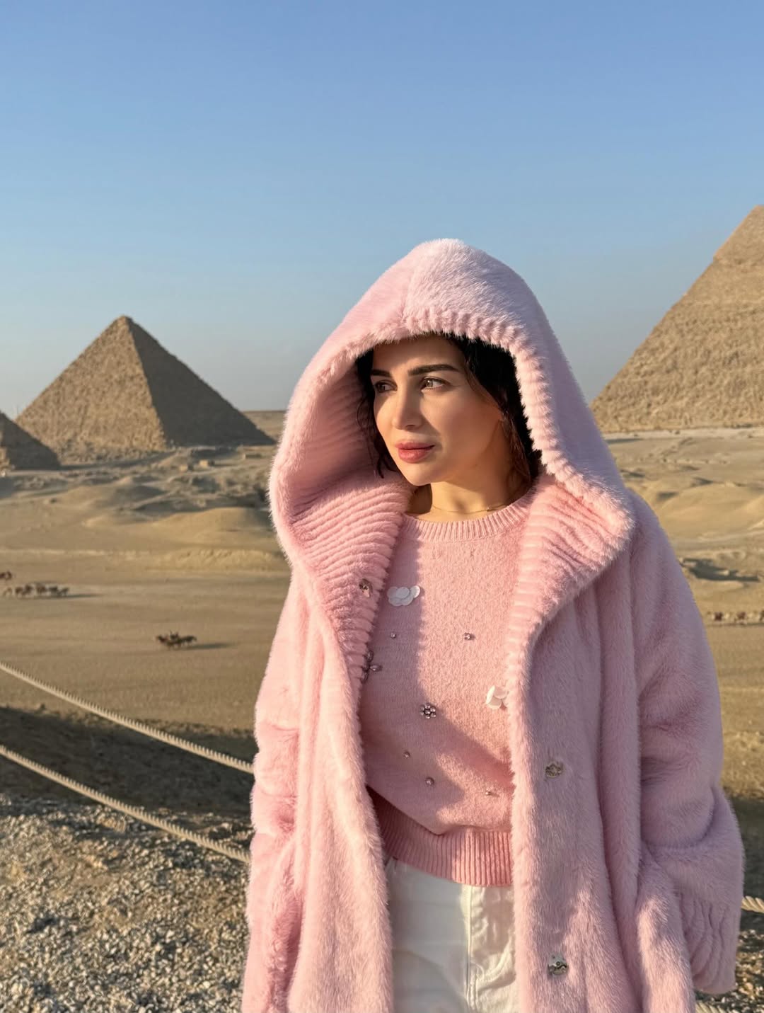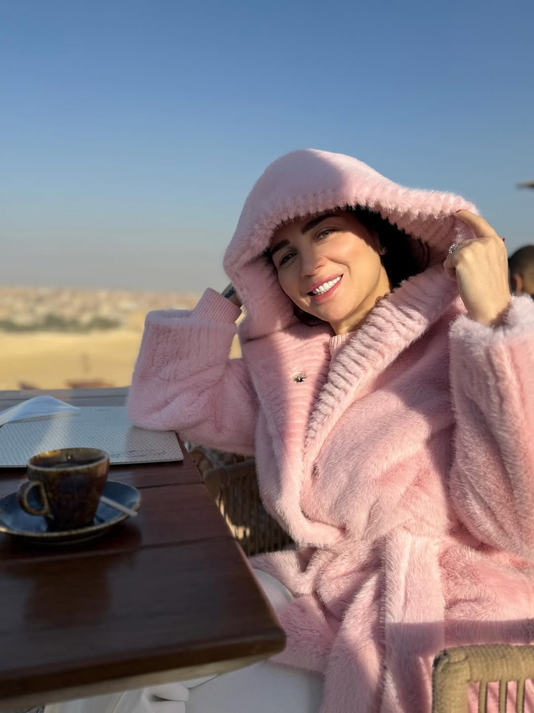 رم - قهوة في حضرة الأهرامات؛ #مي_عز_الدين تستمتع بجمال الجيزة بمعطف وردي يضفي حيوية على ستايلها الشتوي. صور نشرتها عبر "إنستغرام"، جمعت فيها بين عفويتها وسحر الأهرامات.