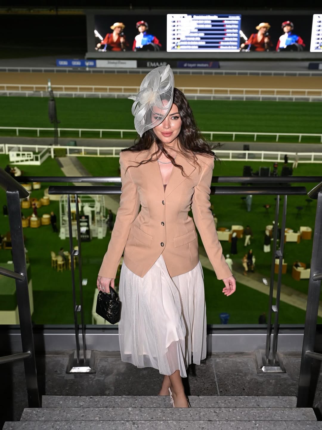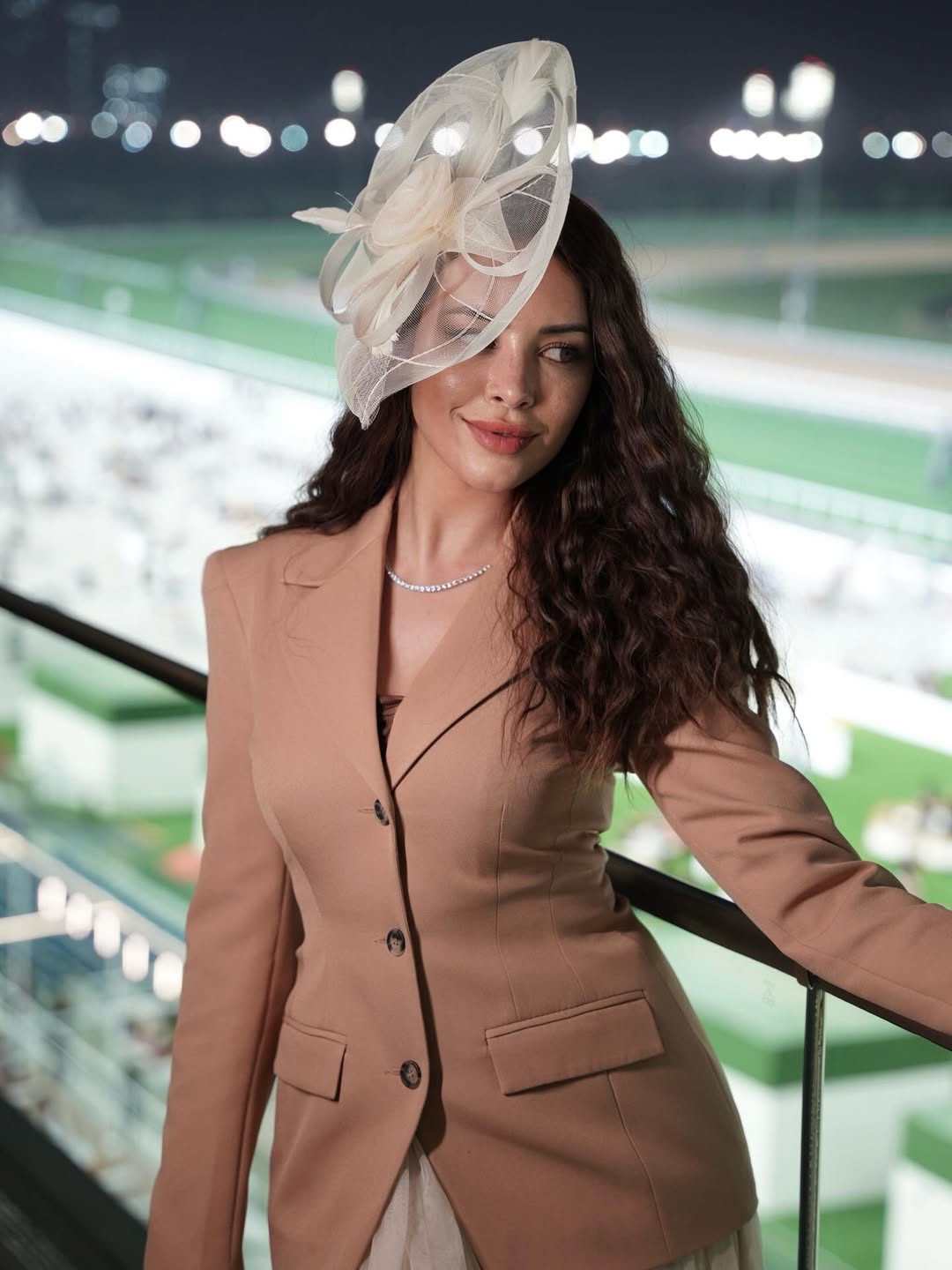 رم - بصمة كلاسيكية وضعتها البلوغر المغربية #عفراء_السطي في مضمار سباق الخيول بدبي. اللوك جاء متزناً بتنورة "بليسيه" بيضاء وبليزر بني بأزرار مغلقة منحها طابعاً رسمياً حاداً وأنيقاً في آن واحد.