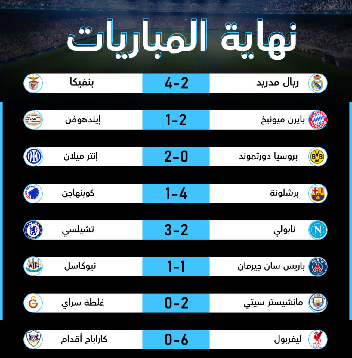وتألق جميع لاعبي الغارنز حيث سجل فكتور غيوكيريس والعائد من الاصابة كاي هافرتز وغابرييل مارتينيلي اهداف المدفعجية، فيما عزز نادي بايرن ميونيخ الالماني من مركزه الثاني بعد فوزه بمواجهة ايندهوفن الهولندي وبواقع 2-1 وسجل العائد من الاصابة جمال موسيالا وهاري كاين هدفي الفوز للفريق الالماني، وبدوره خطف نادي ليفربول الانكليزي المركز الثالث في جدول الترتيب بفوزه الكبير على كاراباخ الاذربيجاني وبواقع 6-0، بينما صعد توتنهام هوتسبيرز الانكليزي الى المركز الرابع بفوزه على اينتراخت فرانكفورت الالماني وبواقع 2-0، وبدوره حسم برشلونة الاسباني المركز الخامس بفوزه الثمين على كوبنهاغن الهولندي وبواقع 4-2 وسجل روبرت ليفاندوفسكي ولامين يامال ورافينيا ومارموس راشفورد اهداف الفريق الاسباني، وبدوره حسم مانشستر سيتي الانكليزي المركز الثامن في جدول الترتيب بفوزه على غلطة سراي التركي وبواقع 2-0 ليحجز ابناء المدرب غوارديولا مقعدهم بين الثمانية الاوائل، وبدوره خطف انتر ميلانو المركز العاشر في جدول الترتيب بعد فوزه على بوروسيا دورتموند الالماني وبواقع 2-0، بينما خطف نادي تشيلسي المركز السادس بفوزه المثير على نابولي وبواقع 3-2 والذي ودع البطولة بشكل مبكر، وبدوره حجز سبورتينغ لشبونة البرتغالي تأهله بعد فوزه على اتلتيك بلباو وبواقع 3-2، وتأهل اليوفنتوس الايطالي بعد حلوله في المركز الثالث عشر بعد تعادله مع موناكو الفرنسي وبواقع 0-0، فيما ودع اولمبيك مارسيليا المنافسات بعد خسارة ثقيلة امام كلوب بروج وبواقع 3-0 ليخطف الاخير المركز الـ19 في جدول الترتيب، وحقق اولمبياكوس اليوناني فوزاً مهماً على اياكس امستردام المتعثر وبواقع 2-1، فيما تلقى نادي اتلتيك مدريد الاسباني خسارة قاسية بمواجهة بودو/غليمت المروجي وبواقع 2-1 ليتراجع الروخي بلانكوس الى المركز الـ14،