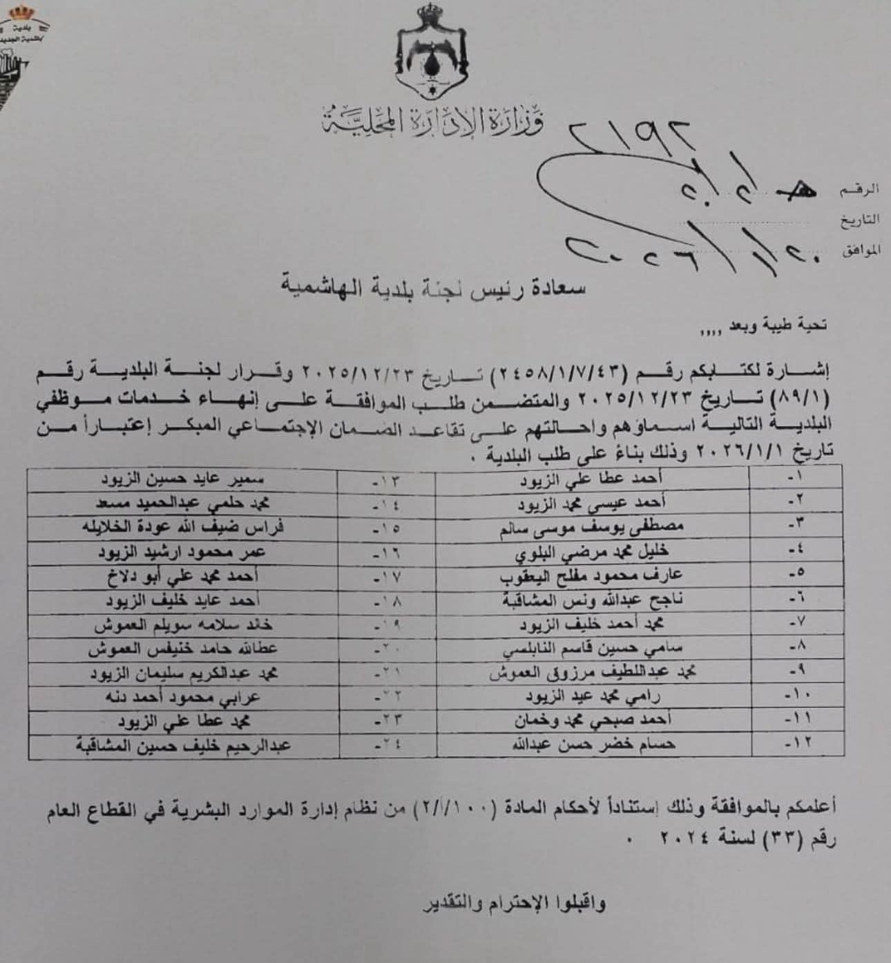 صادق وزير الادارة المحلية على قرار لجنة بلدية الهاشمية المؤقتة باحالة 24 موظفا من البلدية الى التقاعد المبكر وذلك بناء على طلب البلدية