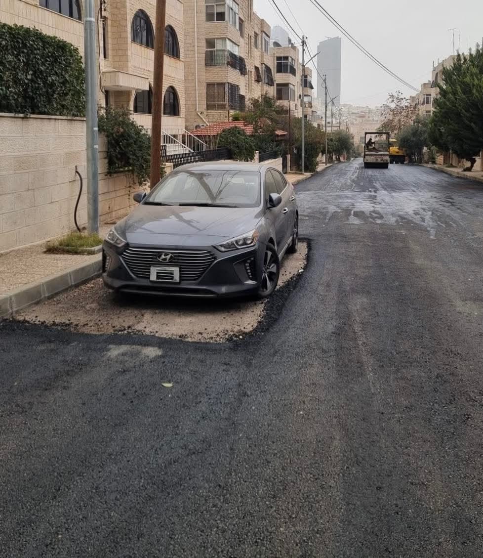 تداول مواطنون على مواقع التواصل الاجتماعي صورة لشارع تم تعبيده مؤخرا ضمن مناطق امانة عمان , حيث تركت الكوادر العاملة جزءا من الشارع بلا تعبيد بذريعة اصطفاف مركبة, حيث تم تعبيد كل ما حول المركبة وترك ما تحته ف