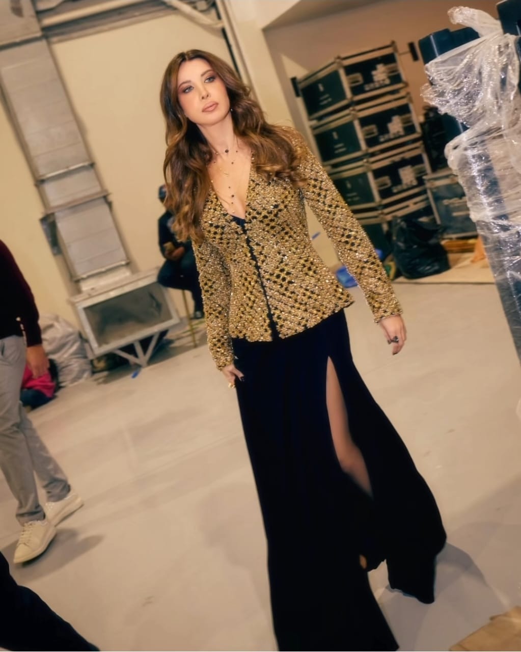 ولفتت النجمة اللبنانية الأنظار بإطلالتها الناعمة التي اختارتها من تصميم المصمم اللبناني نجا سعادة، وتميّز بتفاصيله المميزة وبالتطريزات اللامعة باللون الذهبي من الجهة العلوي للفستان، وحرصت على اجراء بعض التعديلات البسيطة على التصميم الأصلي لتبدو أكثر احتشاماً، حيث قامت بتصير الفتحة الأمامية عند منطقة الصدر. وينسدل الثوب من الأسفل بتنورة سوداء طويلة بتصميم ناعم ومنسدل، مع فتحة جانبية عالية عند الفخذ، لتبدو إطلالتها أكثر رقي وأناقة.