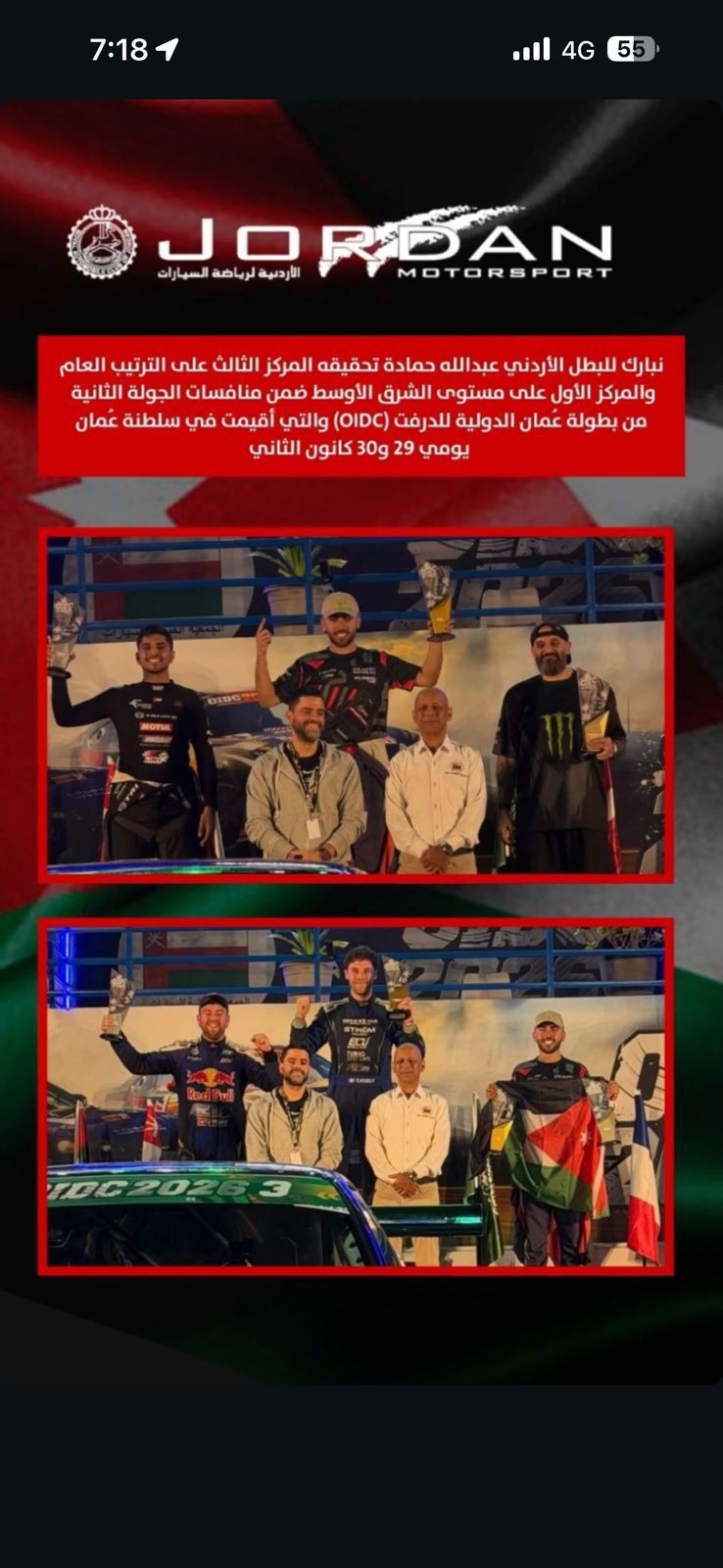 سجل المتسابق الاردني عبدالله حمادة انجازا عالميا جديدا بعد ان احرز المركز الاول على مستوى الدول العربية والشرق الاوسط والمركز الثالث عالميا في سباق السيارات الذي اقيم مؤخرا في العاصمة العمانية مسقط