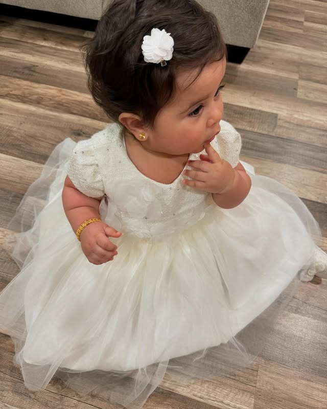 وكانت الصور مليئة بالألوان والأجواء المرحة السعيدة، كما ظهرت الطفلة بفستان أبيض لافت بجانب قالب الكيك وحلويات الحفل.