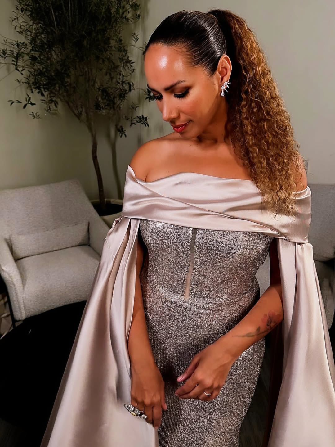 رم - شهد حفل افتتاح ألعاب الماسترز في أبوظبي حضوراً لافتاً للنجمة البريطانية #ليونا_لويس، التي اختارت فستاناً انسيابياً يمزج بين الفضي ولون الشامبين. التصميم الذي حمل توقيع "خالد ومروان"، تميز بصيحة الـ Off-shoulder مع "كيب" طويل وتطريزات دقيقة عززت من فخامة الإطلالة.