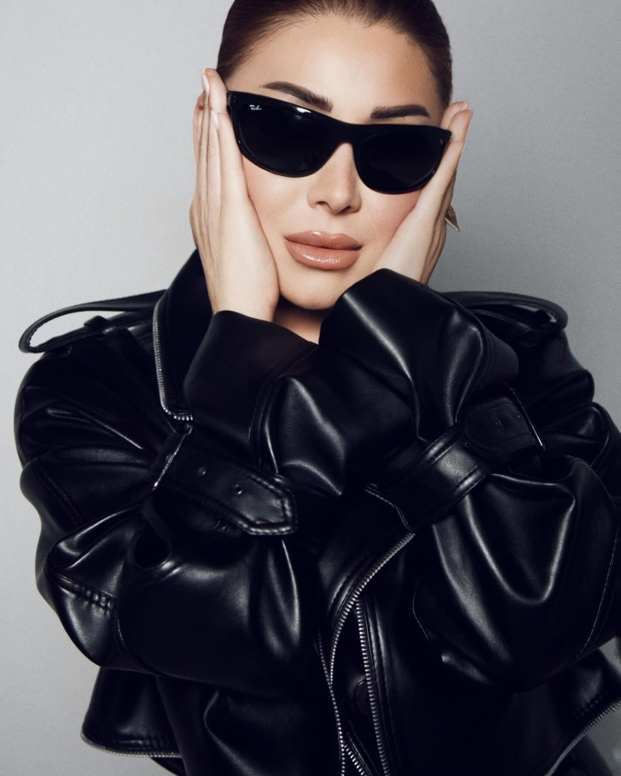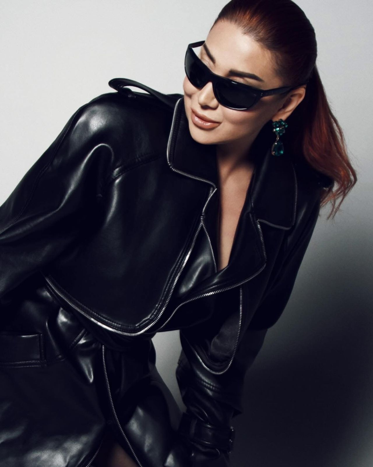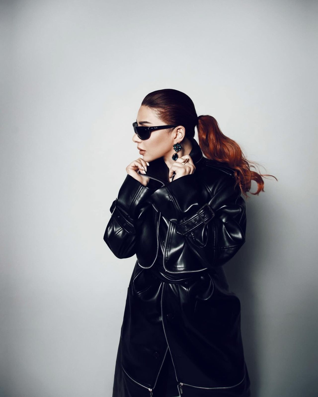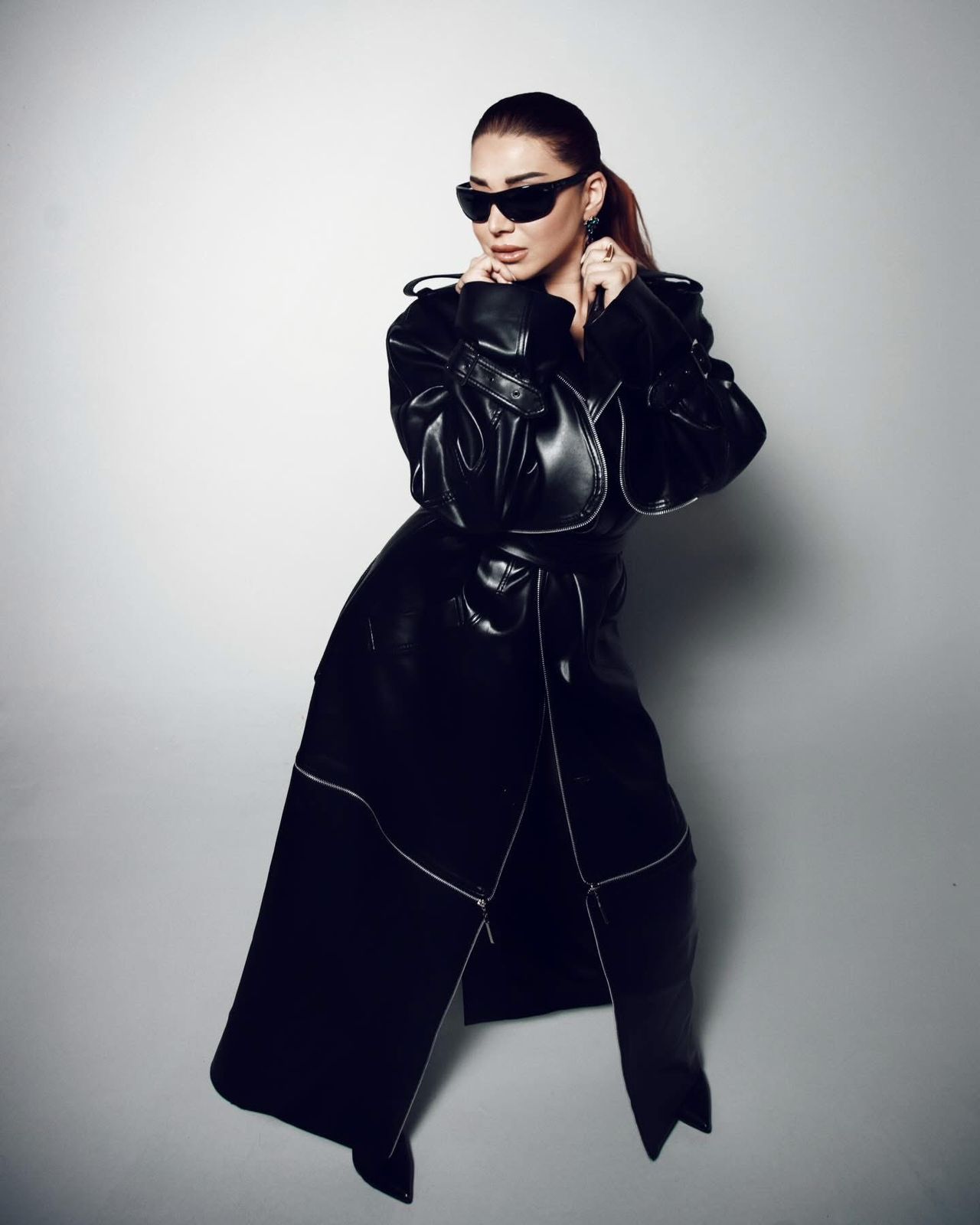 وجاءت الإطلالة بلمسة "جلديّة" كاملة من خلال معطف طويل باللون الأسود اللامع، تميز بتفاصيل السحابات العصرية والياقة العريضة التي منحت اللوك طابعًا قويًا وحيويًا.