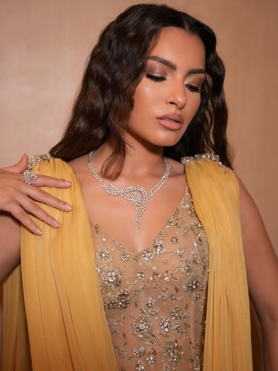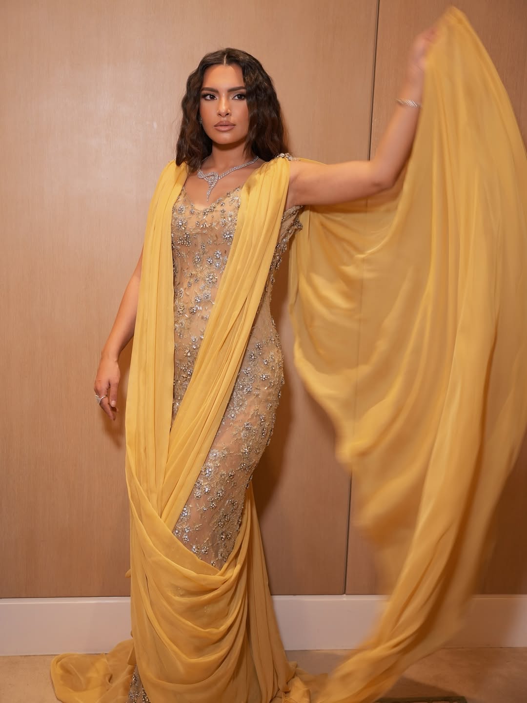 الإطلالة جاءت من توقيع المصمّمة المصرية #شهيرة_لاشين، وجمعت بين فستان نيود مزيّن بالكريستالات اللامعة، وطبقة من الشيفون الأصفر الناعم.