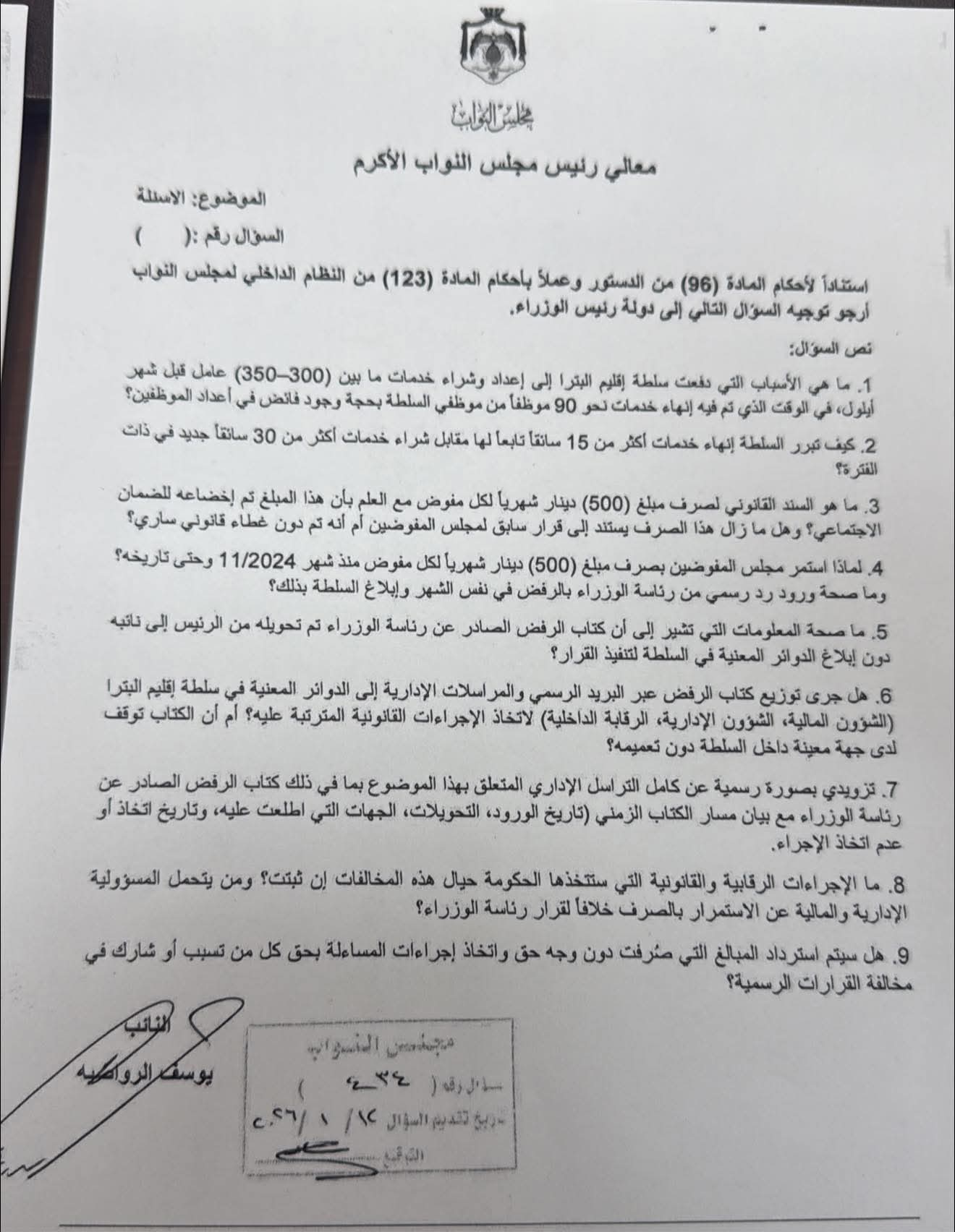 عبر النائب يوسف الرواضية عن غضبه الشديد من تجاهل رئاسة سلطة إقليم البترا الأسئلة المتعلقة بالمكافآت والحوافز التي كان وجهها بمذكرة نيابية.