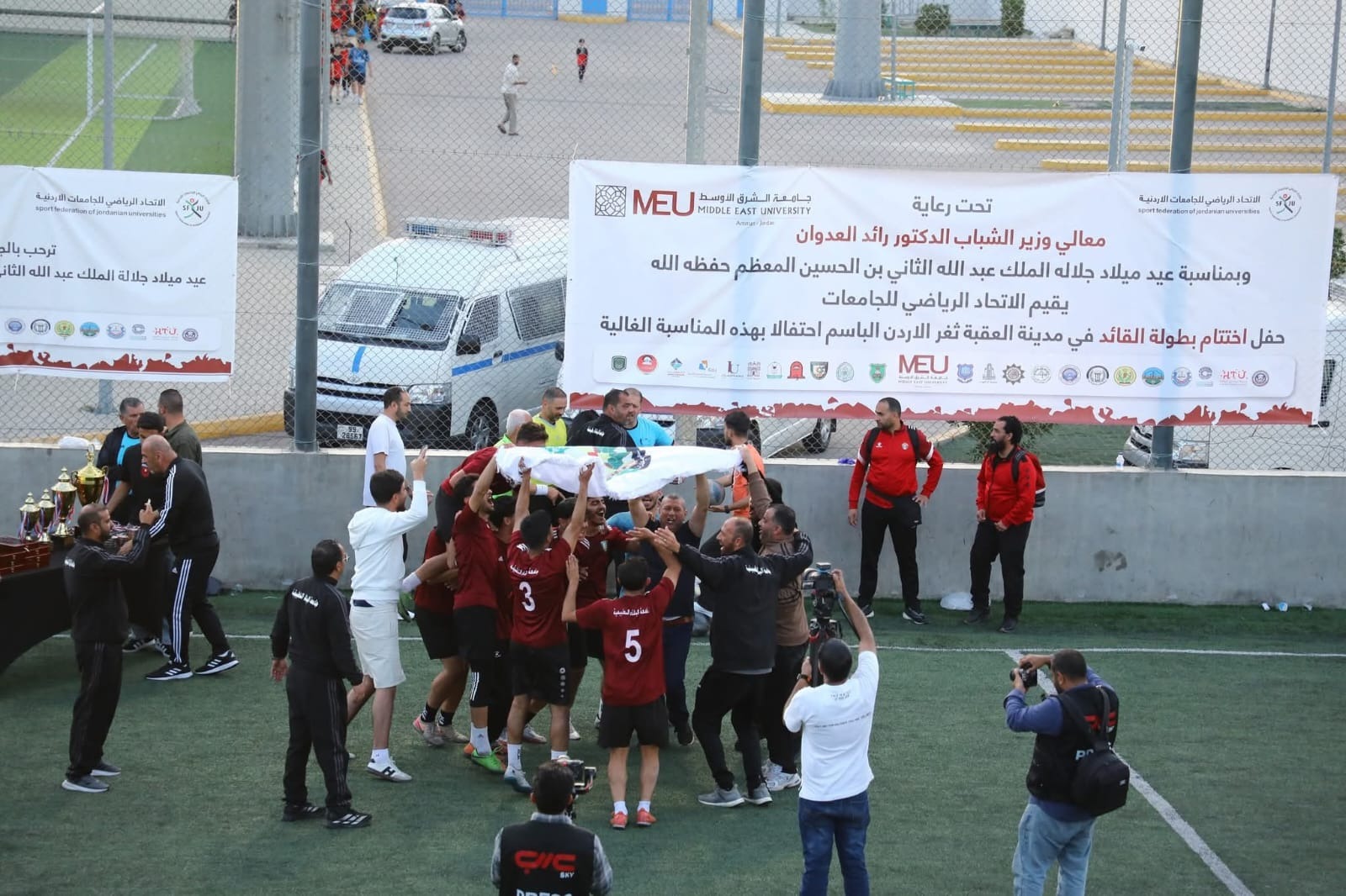 وجرى التتويج تحت رعاية معالي الدكتور رائد العدوان وزير الشباب، وذلك في إطار حرص الوزارة على دعم الرياضة الجامعية وتعزيز مشاركة الشباب في مختلف البطولات والمسابقات.