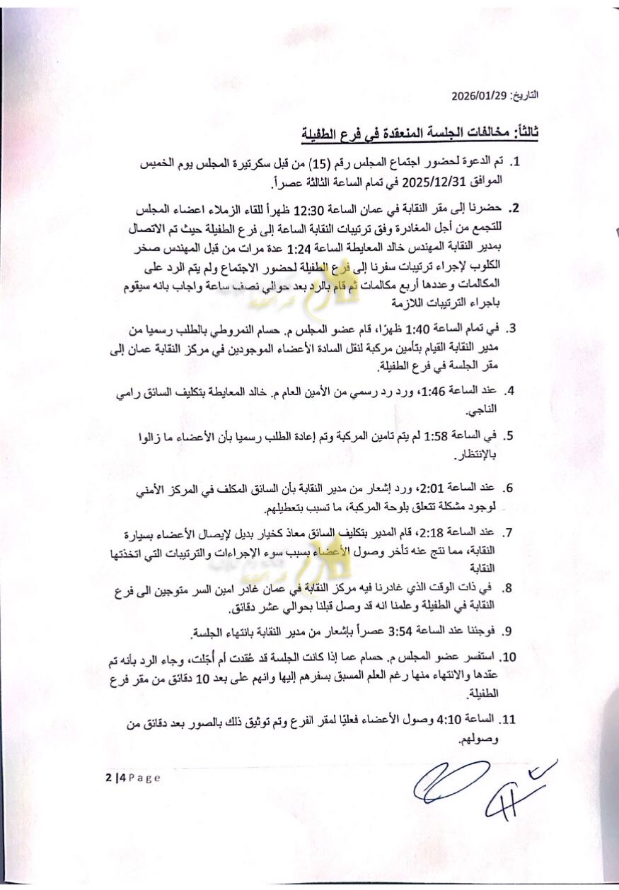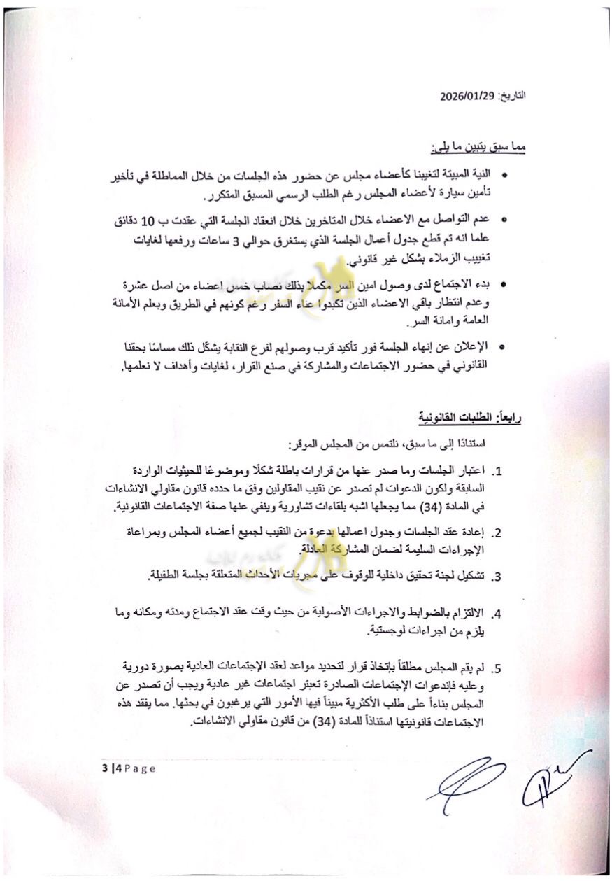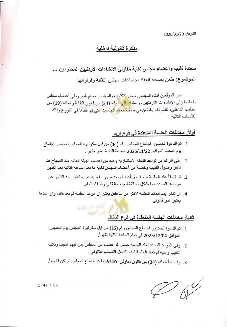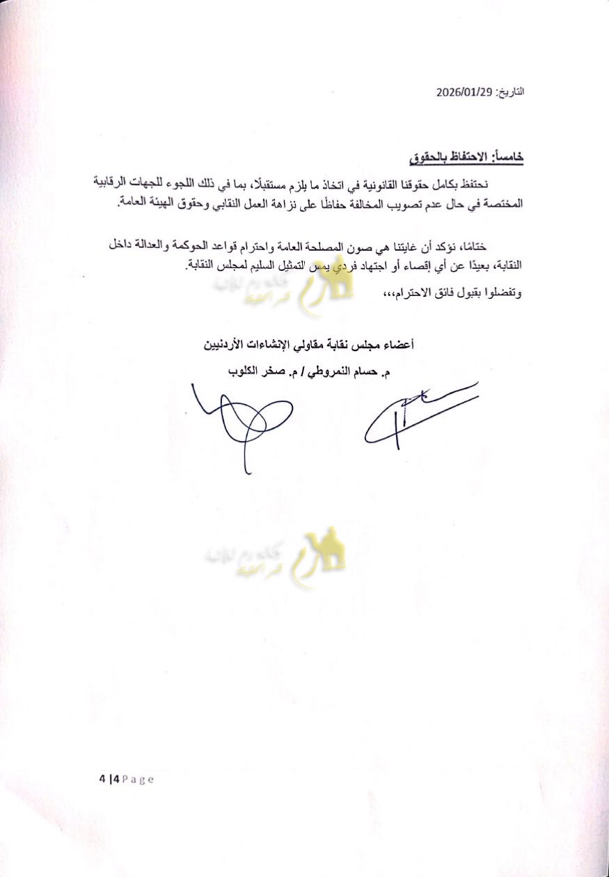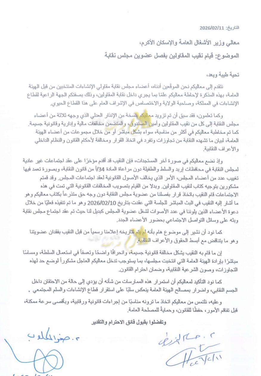 وطالب العضوان وزير الأشغال ومجلس النقابة باعتبار الاجتماعات التي بُني عليها القرار باطلة قانونياً، وإعادة تصويب الإجراءات وفق الأصول، وتشكيل لجنة تحقيق للوقوف على مجريات الأحداث، مؤكدين أنهم ماضون في اتخاذ جميع الإجراءات القانونية المتاحة، بما في ذلك اللجوء إلى القضاء الأردني، دفاعاً عن حقوقهم وحمايةً لمسار العمل النقابي وإرادة الهيئة العامة.