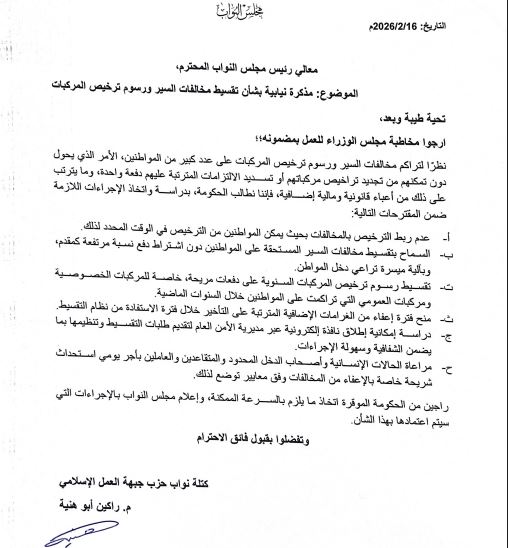 وطالبت المذكرة النيابية الذي وقع عليها 28 نائبًا، إلى تقسيط رسوم مخالفات السير السنوية على دفعات مريحة، ومنح المواطنين فترة إعفاء من الغرامات الإضافية المترتبة على التأخير.