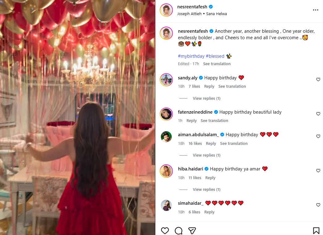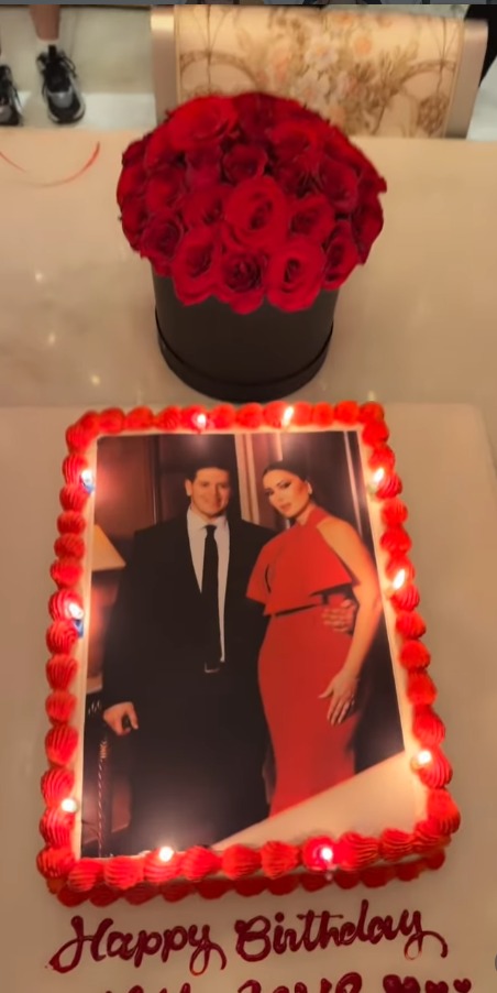 ونشرت النجمة السورية عبر حسابها على "إنستغرام" مقطع فيديو وثّقت من خلاله تفاصيل المفاجأة التي أعدّها لها زوجها، حيث ظهرت لحظة دخولها إلى غرفة مليئة بالبالونات المعلّقة على هيئة قلوب، بألوان الأحمر والذهبي، فيما كُتبت عبارة "كل عام وأنتِ بخير حبيبي" باستخدام بالونات ذهبية على شكل حروف. كما حرص زوجها على تنسيق طاولة أنيقة وُضعت عليها باقتان كبيرتان من الورود الحمراء، مغلّفتان بورق زهري، إلى جانب قالب حلوى صُمّم خصيصاً بصورة تجمعهما معاً.