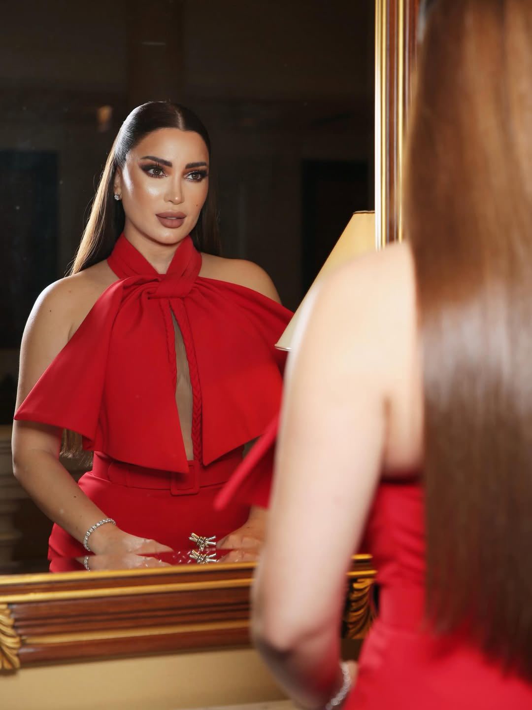 وبمناسبة عيد الحب، تألّقت نسرين طافش أيضاً بفستان طويل من توقيع مصمّمة الأزياء نور فتح الله، صُنع من المخمل باللون الأحمر الناري، وجاء بتصميم ضيّق من الأعلى مع تفصيلة "أوف شولدر" ناعمة، وخصر محدّد أبرز رشاقة قوامها، لينسدل بعد ذلك بتنورة واسعة، فيما زيّن ظهر الفستان "فيونكة" كبيرة الحجم أضافت المزيد من الفخامة والأناقة.