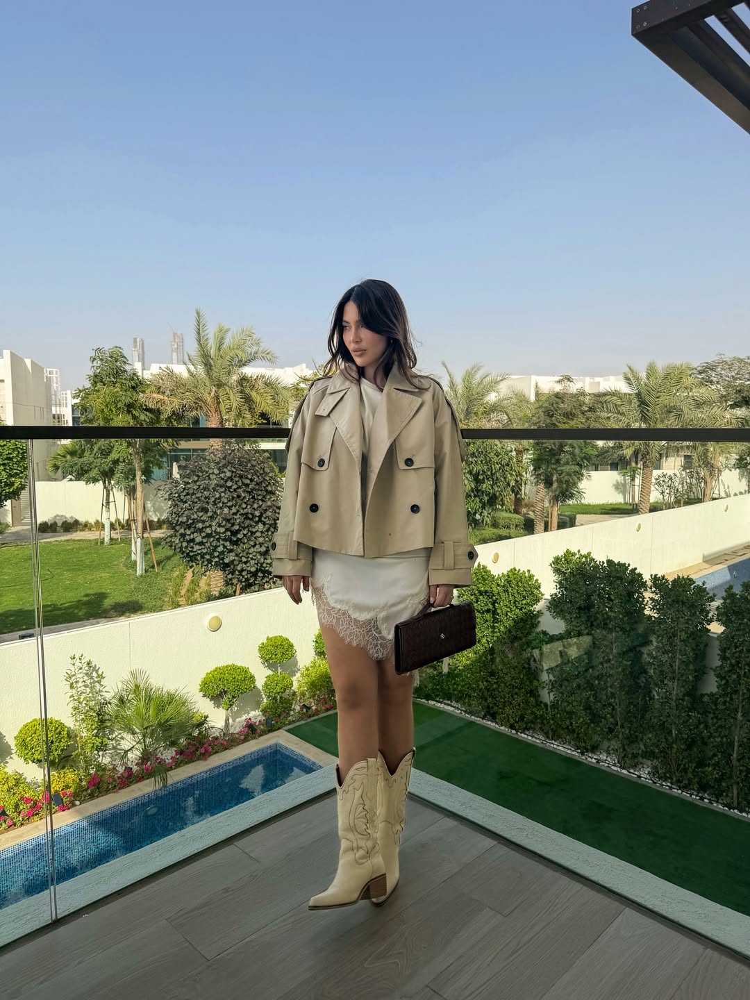 رم - اختارت رائدة الأعمال السورية #لين_برنجكجي ستايلا عصريا بإطلالتها الأخيرة مكونا من فستان أبيض من الساتان مزين بنقوش الدانتيل من أسفله وأضافت فوقه جاكيت "المعطف" القصير باللون البيج بينما ارتدت حذاء Cowboys بساق عالية كسرت من كلاسيكية اللوك.