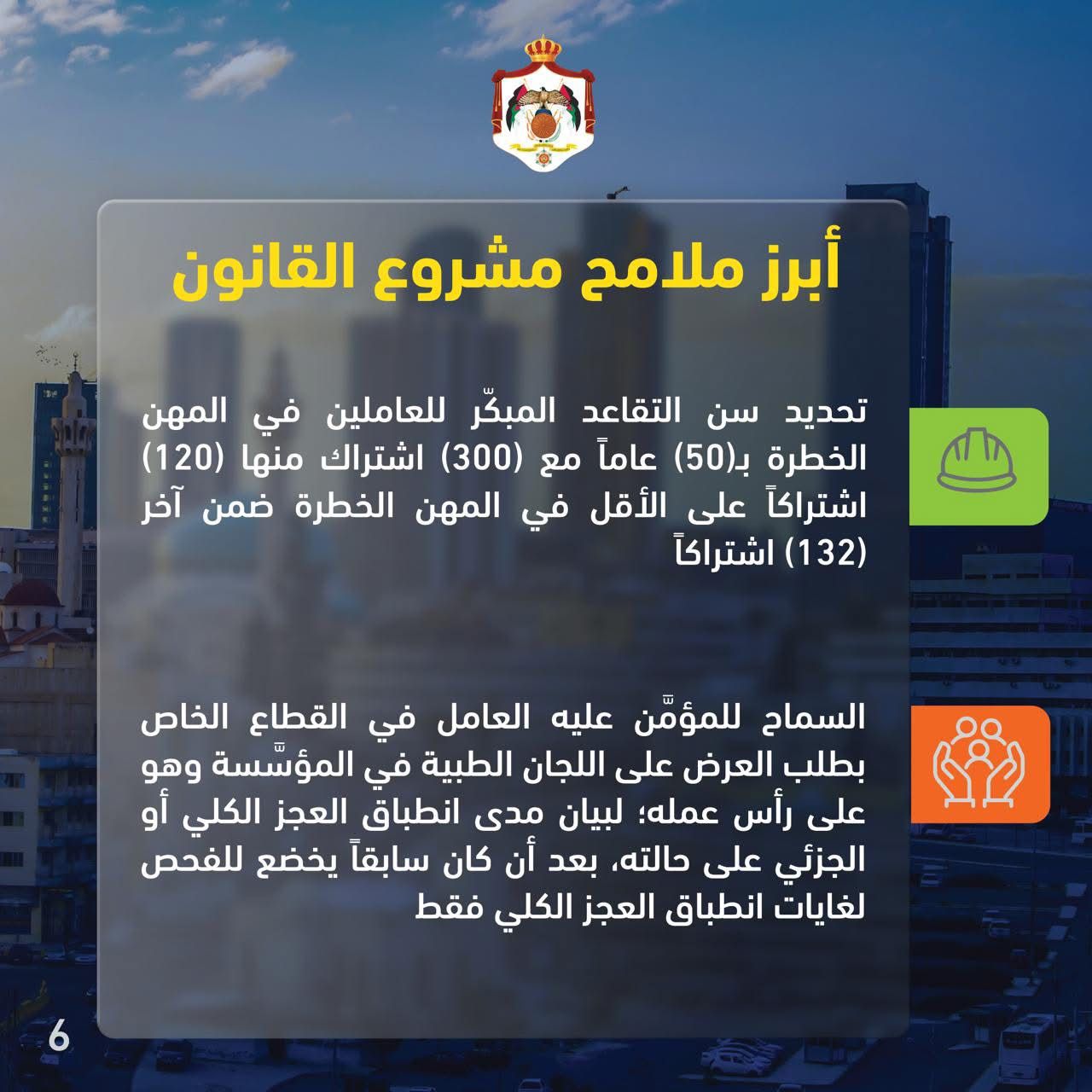 مشروع القانون المعدل حدد سن التقاعد المبكر للعاملين في المهن الخطرة بـ50 عاماً مع 300 اشتراك منها 120 اشتراكاً على الأقل في المهن الخطرة ضمن آخر 132 اشتراكاً.