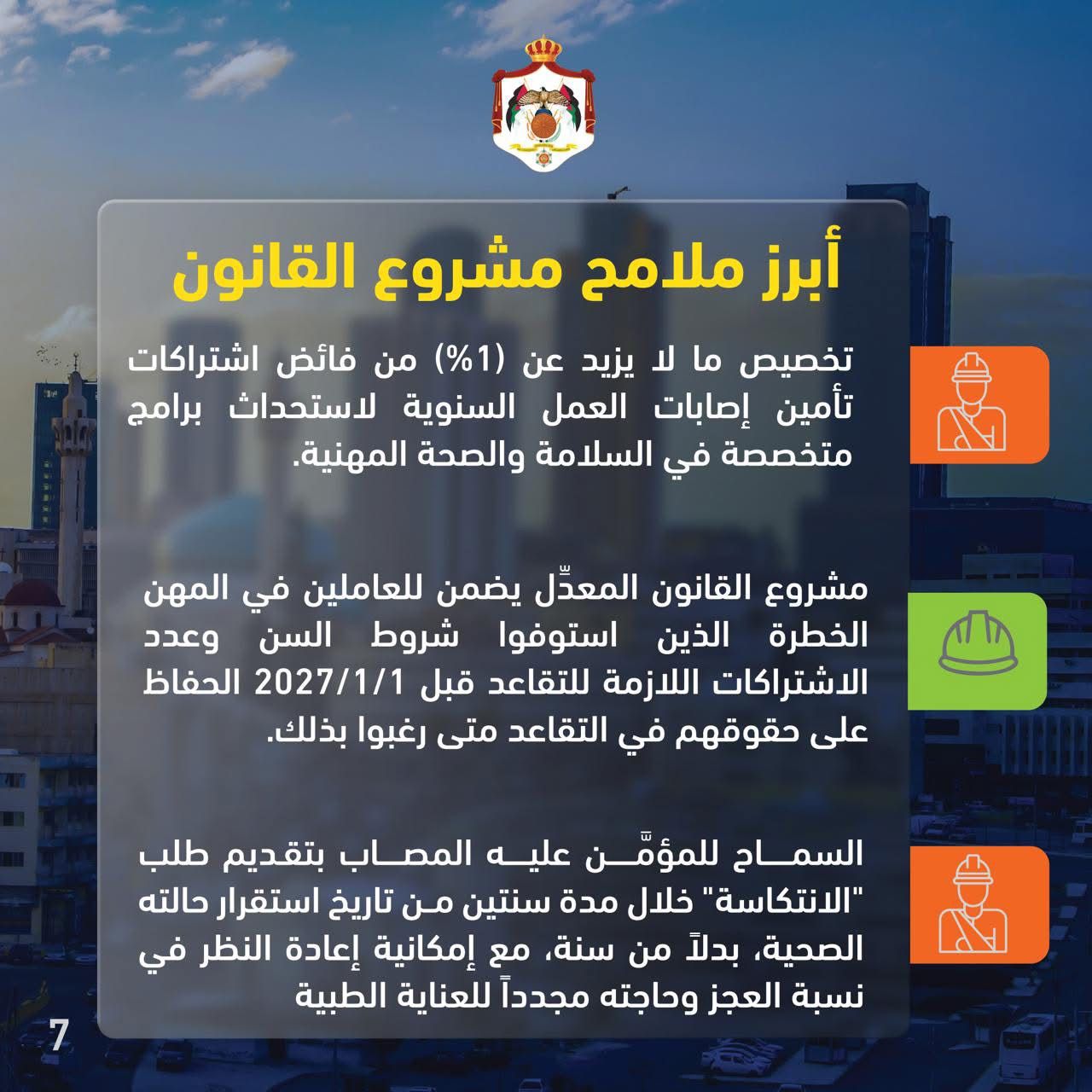 مشروع القانون المعدِّل يضمن للعاملين في المهن الخطرة الذين استوفوا شروط السن وعدد الاشتراكات اللازمة للتقاعد قبل 1/1/2027 الحفاظ على حقوقهم في التقاعد متى رغبوا بذلك.